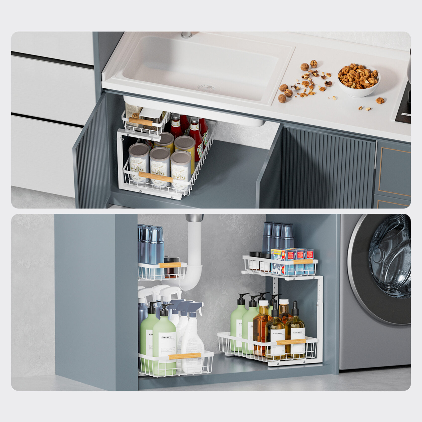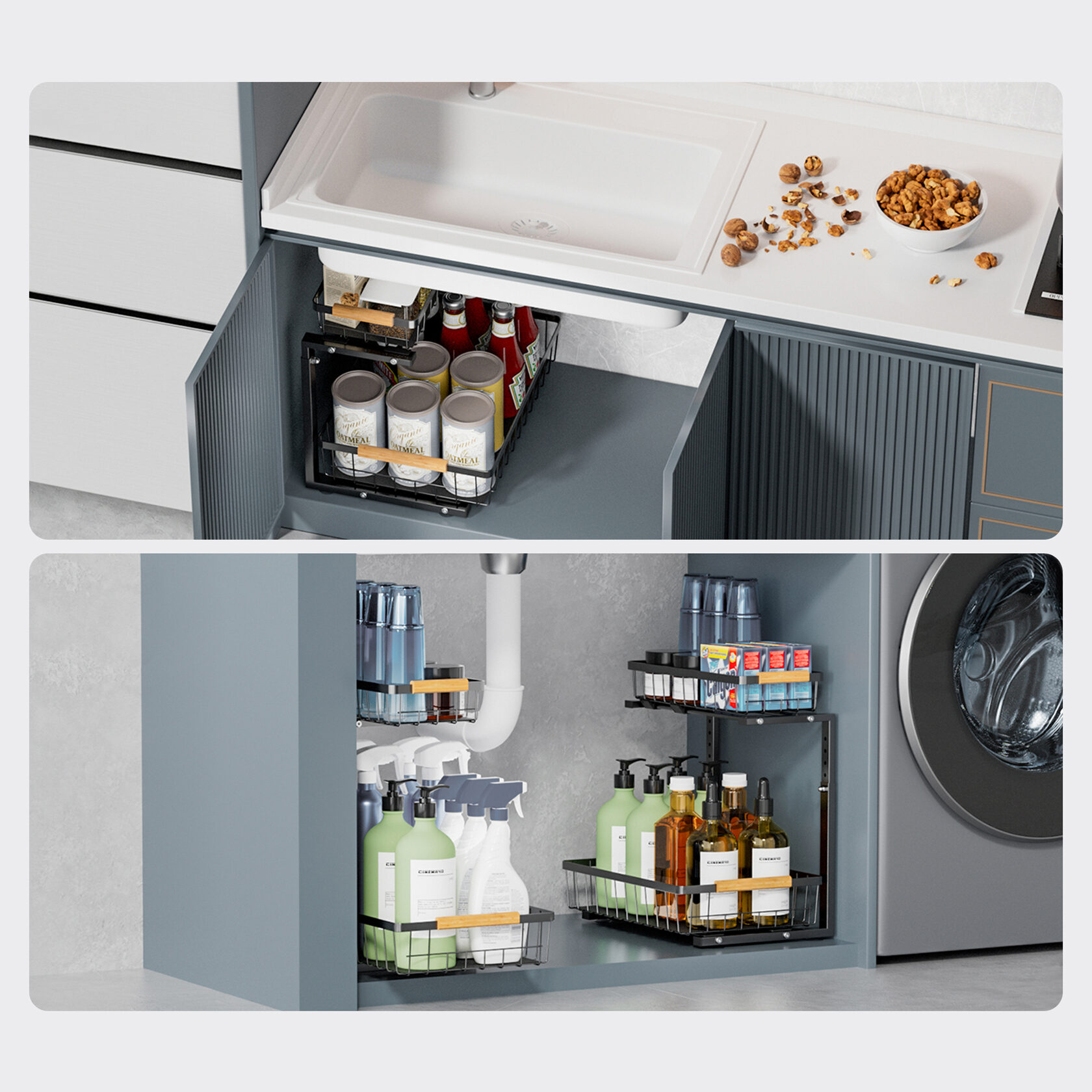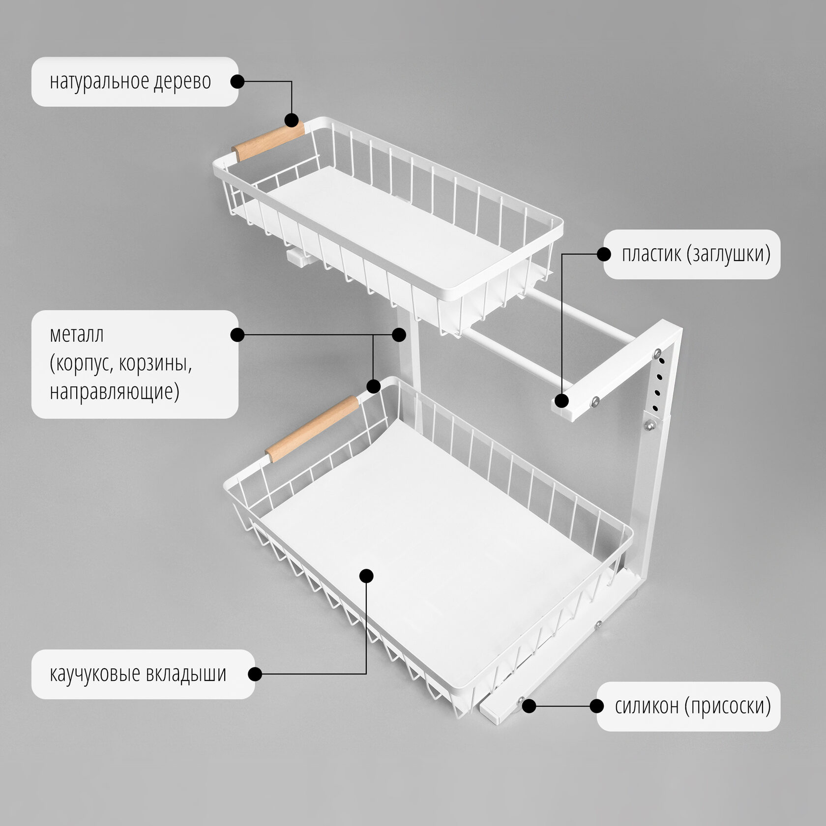 Этот стильный органайзер под кухонную раковину выполнен в уникальном Г-образном дизайне, который идеально подходит для размещения вокруг изогнутых труб. Он поможет вам максимально эффективно использовать пространство под раковиной для хранения.