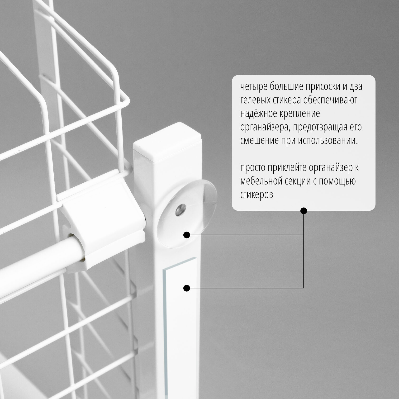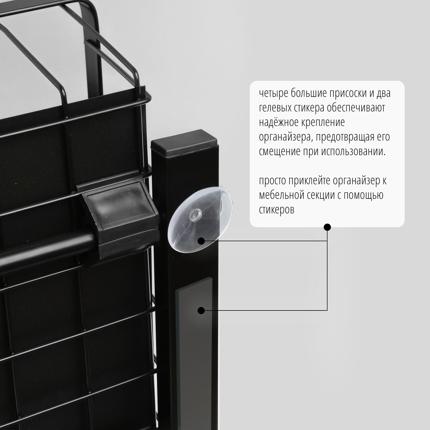 - Надёжная фиксация: четыре большие присоски и два целевых стикера обеспечивают надёжное крепление органайзера, предотвращая его смещение при использовании.