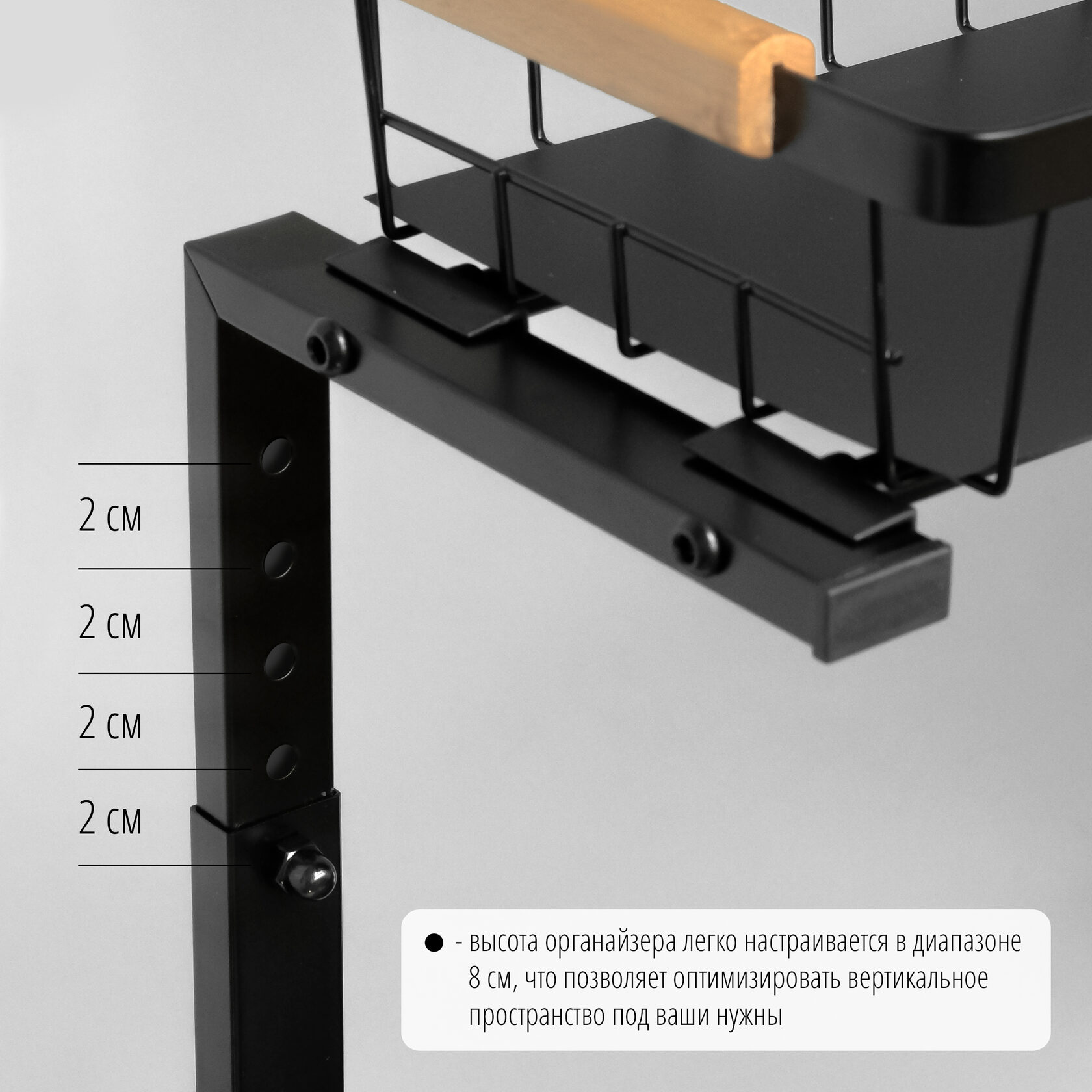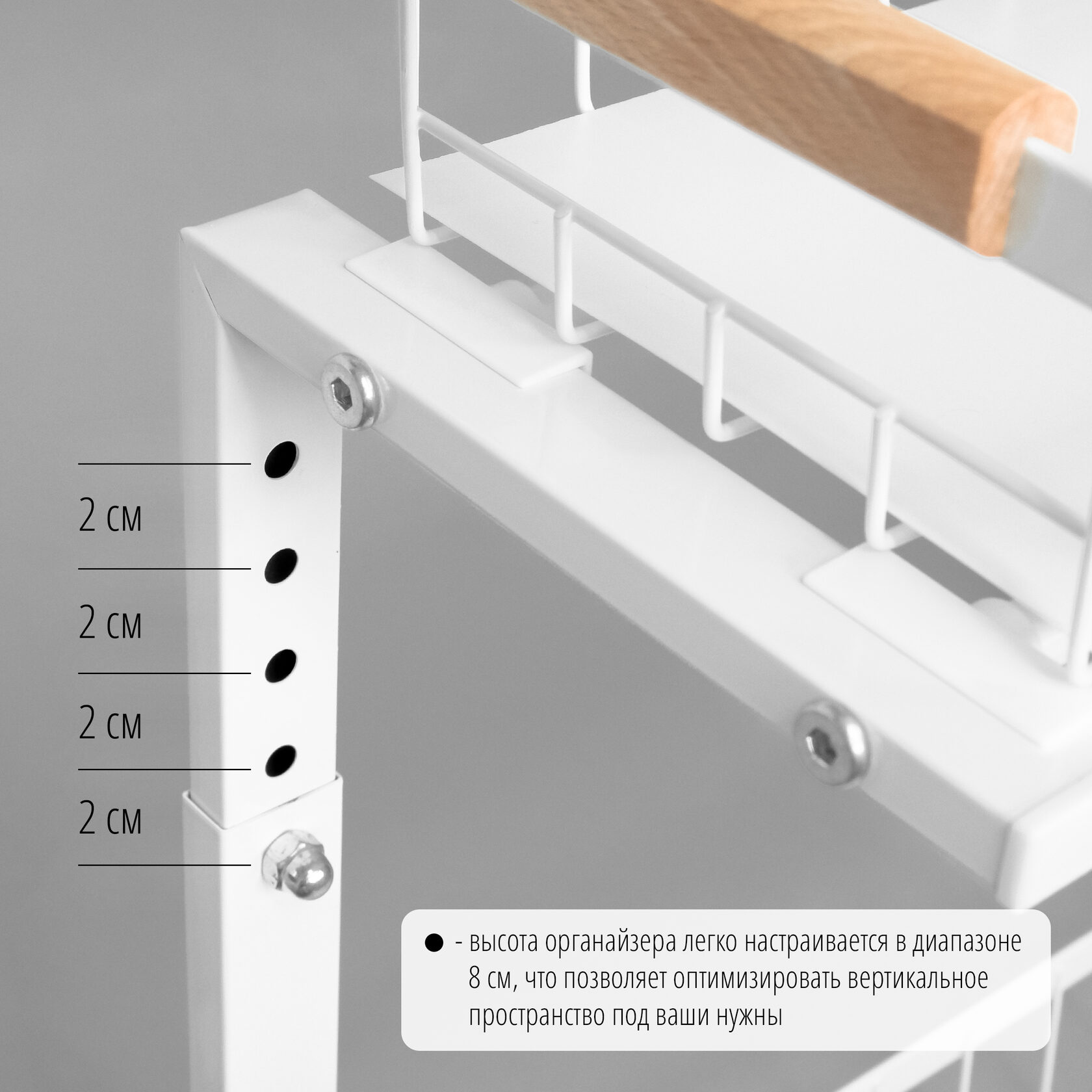 - Регулировка высоты: высота органайзера легко настраивается в диапазоне от 35 до 43 см, что позволяет хранить даже высокие бутылки и оптимизировать вертикальное пространство.
