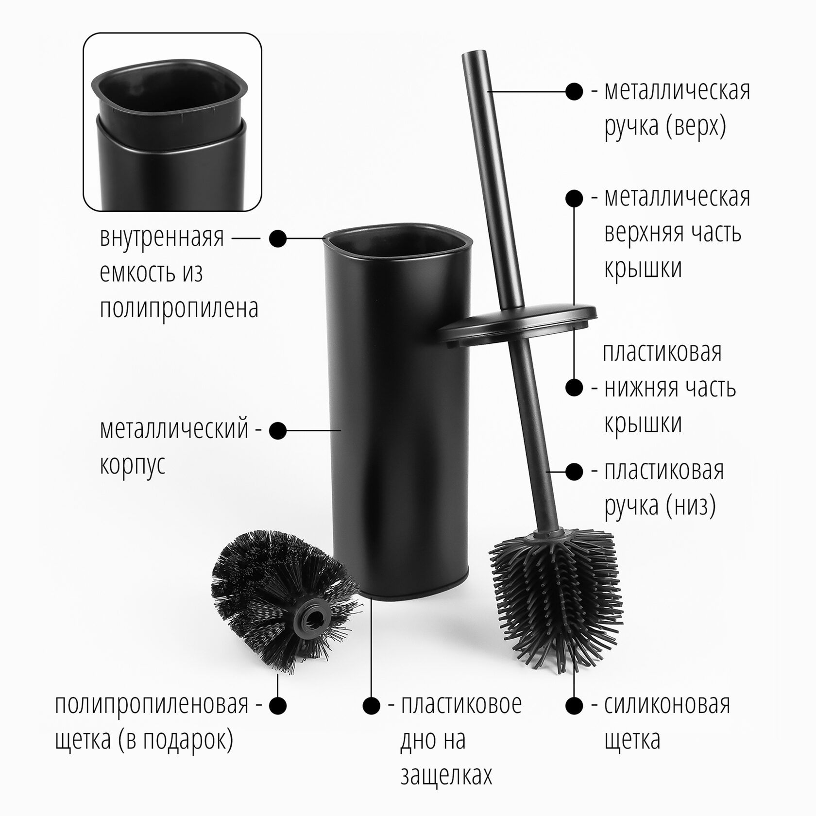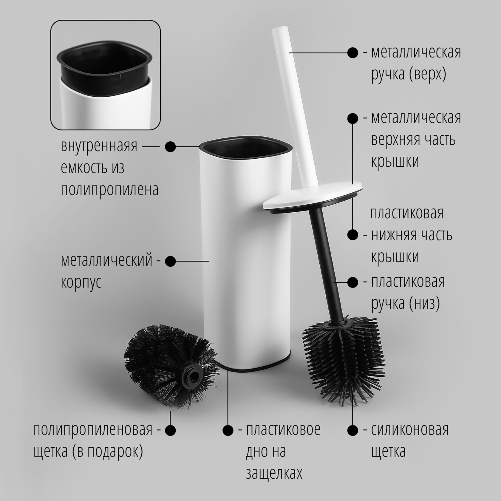 Комплектация - корпус металлический с дном из полипропилена - ручка (внешняя металлическая и внутренняя пластиковая) - крышка (внешняя металлическая и внутренняя пластиковая части) - внутренняя пластиковая емкость - щетка из силикона - щетка из полипропилена