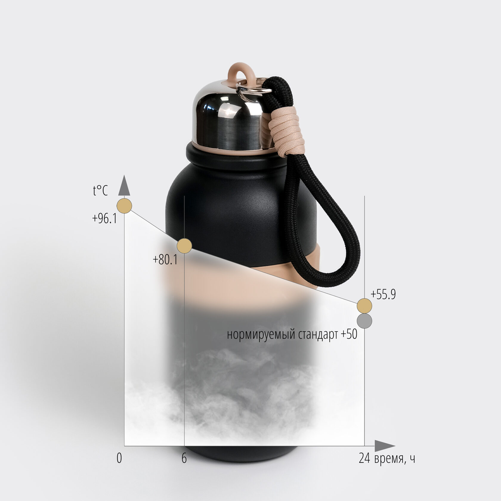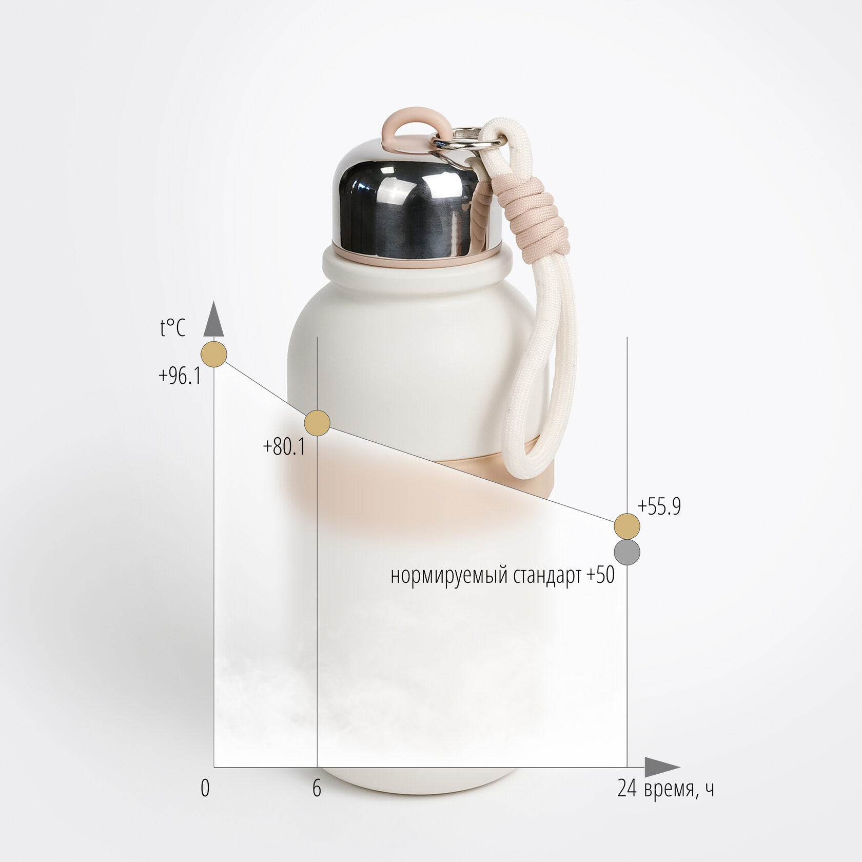 Надежно сохраняет температуру чая или воды на весь день. Испытания, проведенные в лаборатории по ГОСТу, показали, что спустя 24 часа термос сохраняет температуру 55.9°C, что соответствует требованиям.