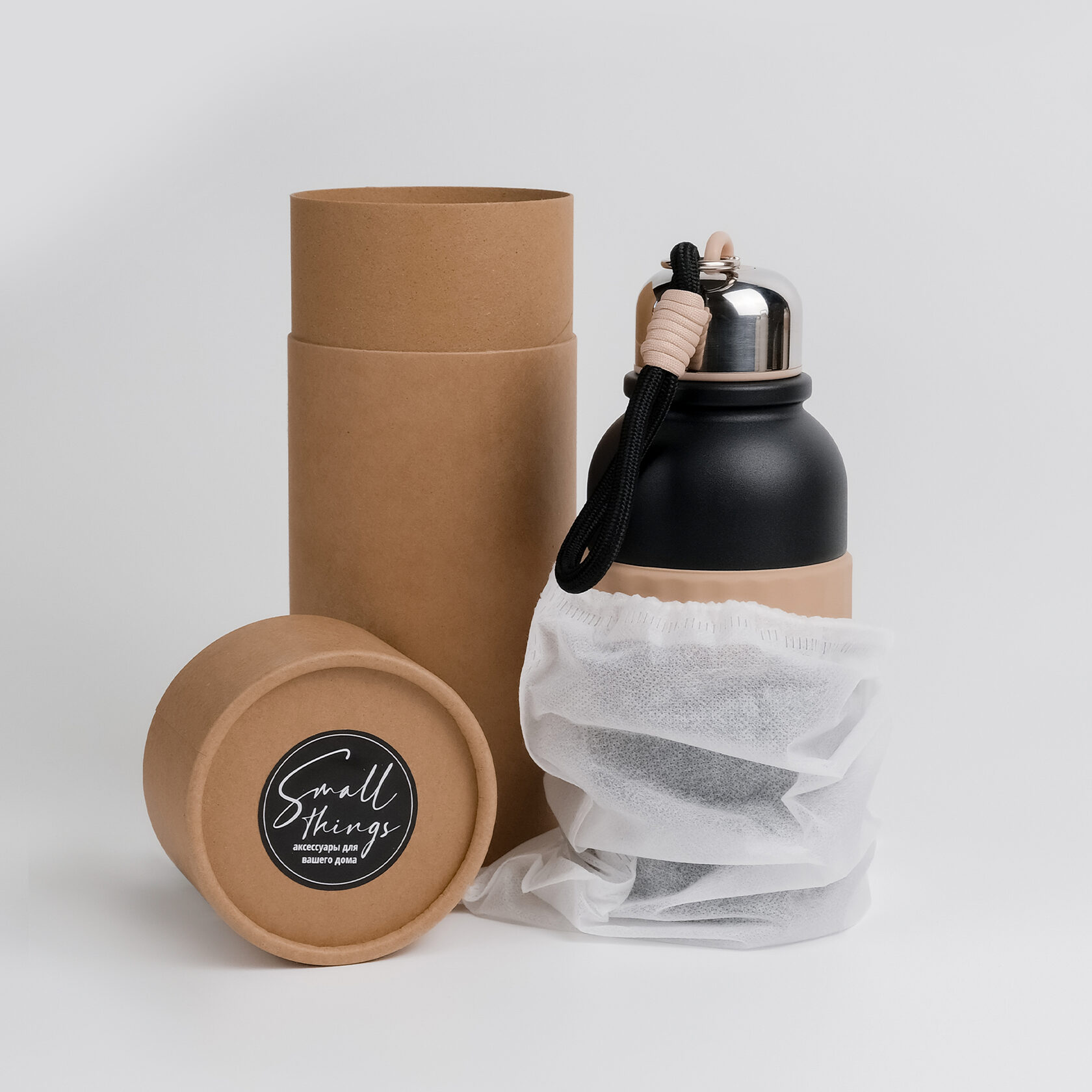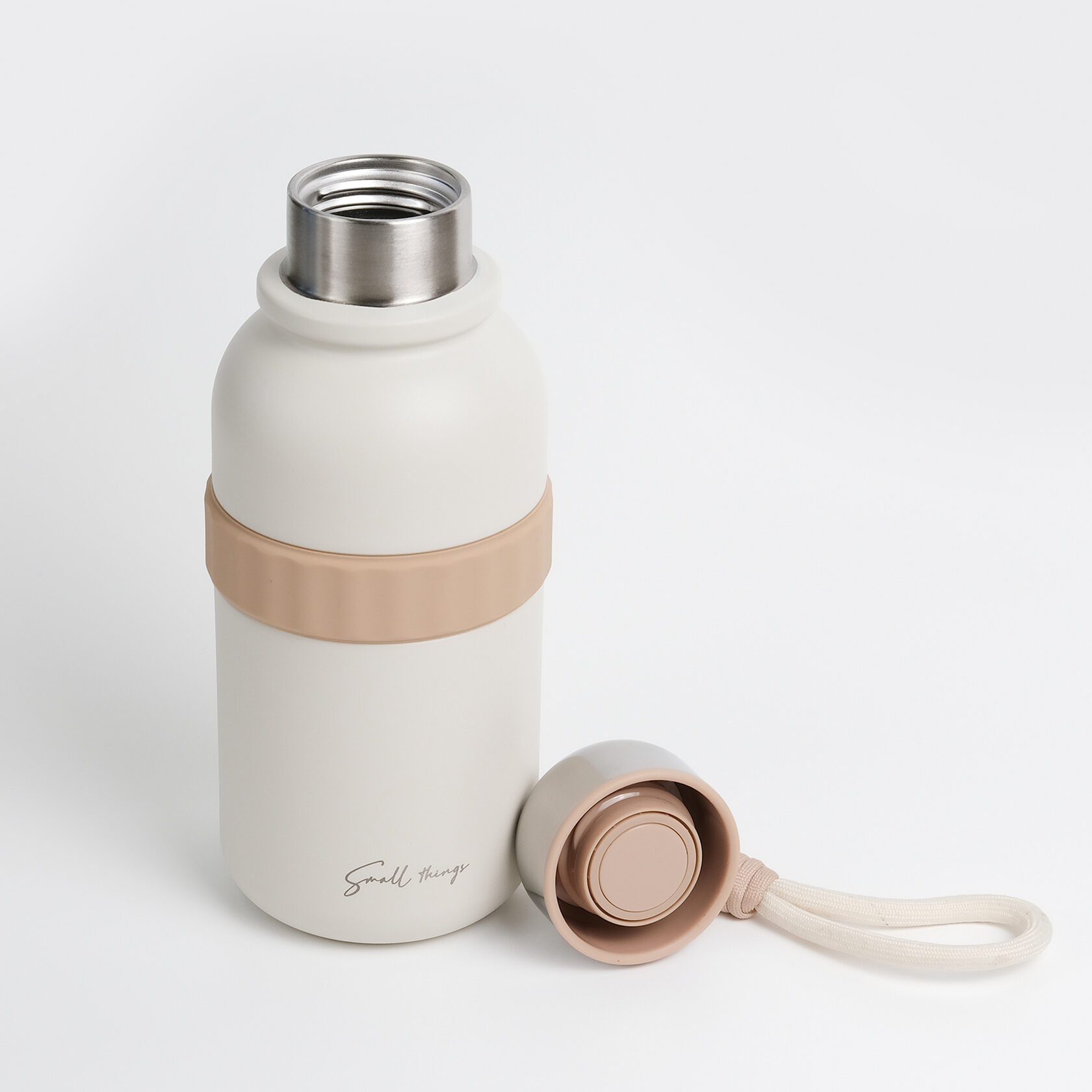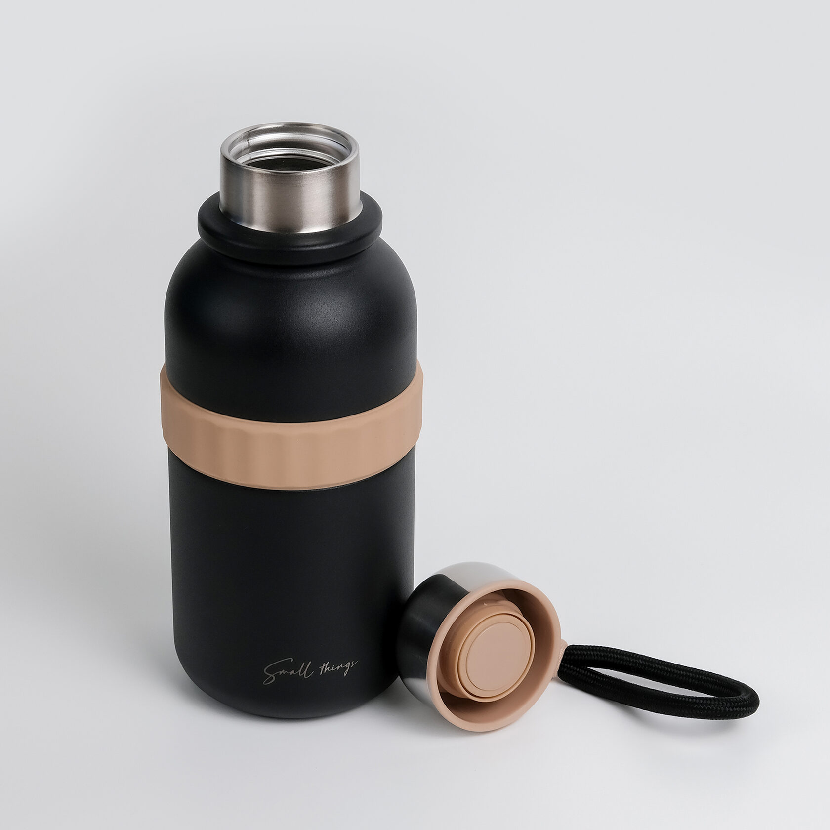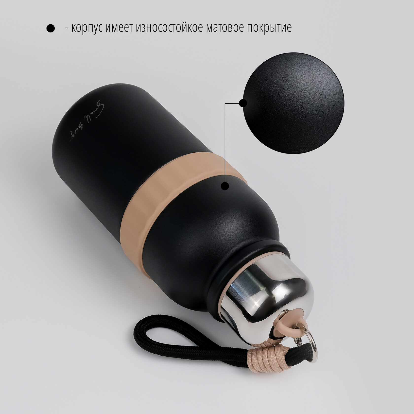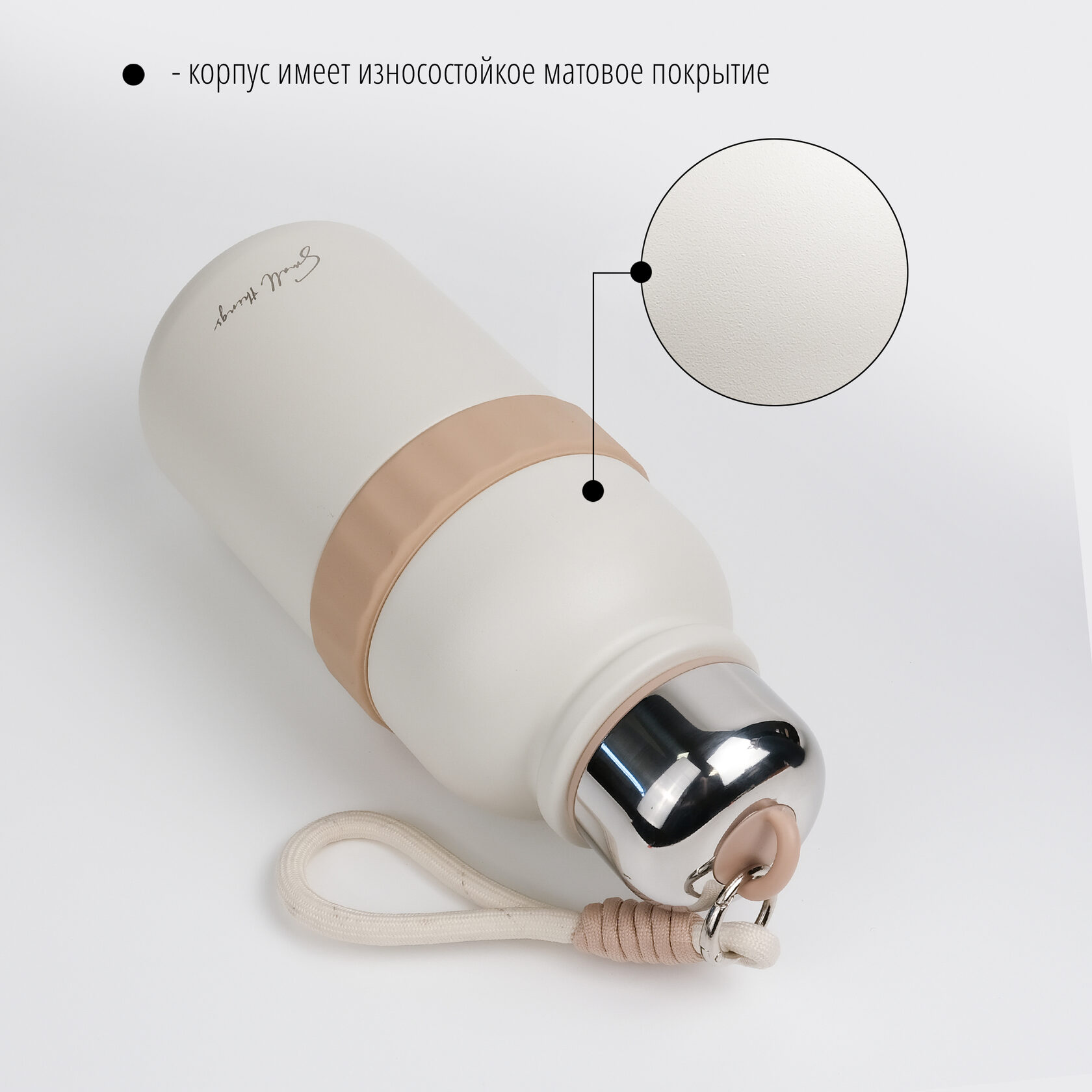 В комплекте с термосом идет ремешок на карабине. С ним удобно носить бутылку, а при необходимости его легко отстегнуть.