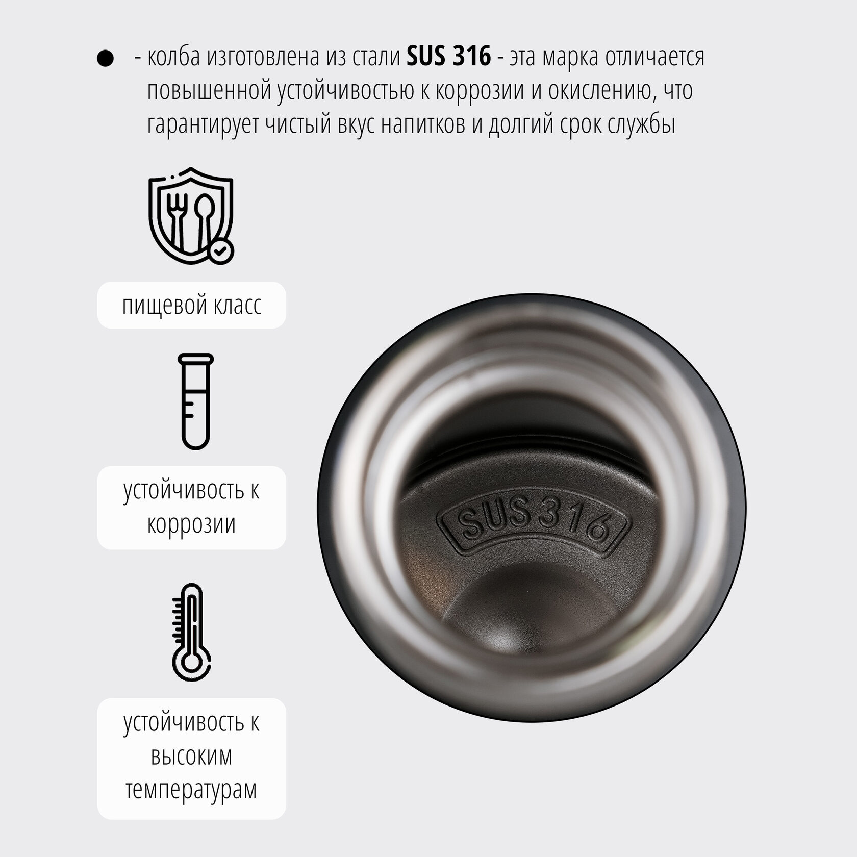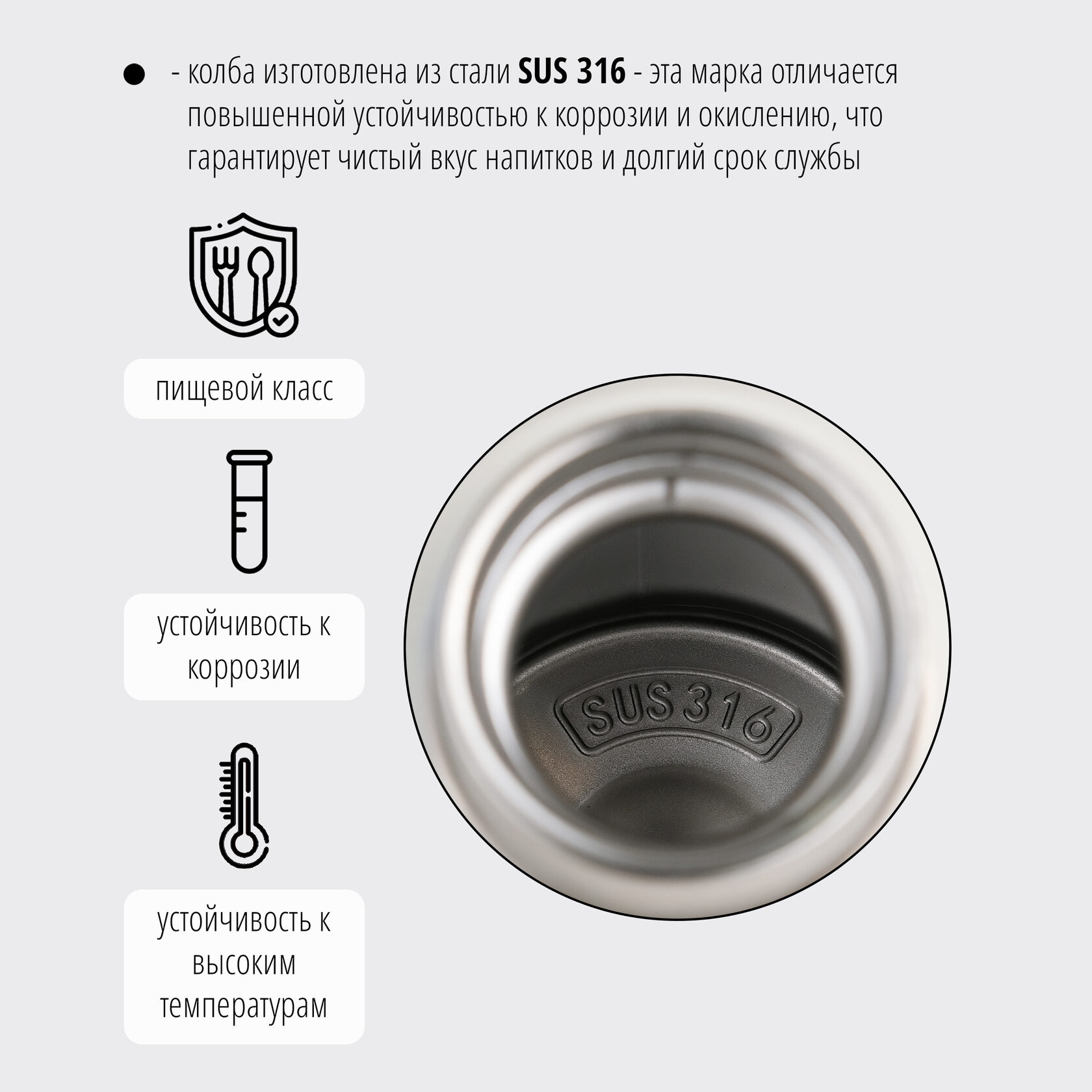 Термос изготовлен из нержавеющей пищевой стали SUS 316 — эта марка отличается повышенной устойчивостью к коррозии и окислению, что гарантирует чистый вкус напитков и долгий срок службы. Снаружи корпус имеет износостойкое матовое покрытие и силиконовое кольцо, чтобы термос удобно лежал в руке. Крышка-пробка выполнена из качественного полипропилена с уплотнительным кольцом из пищевого силикона. У бутылки широкое горлышко для питья.