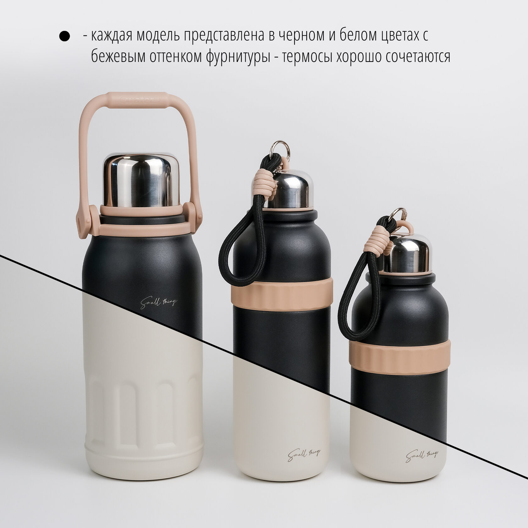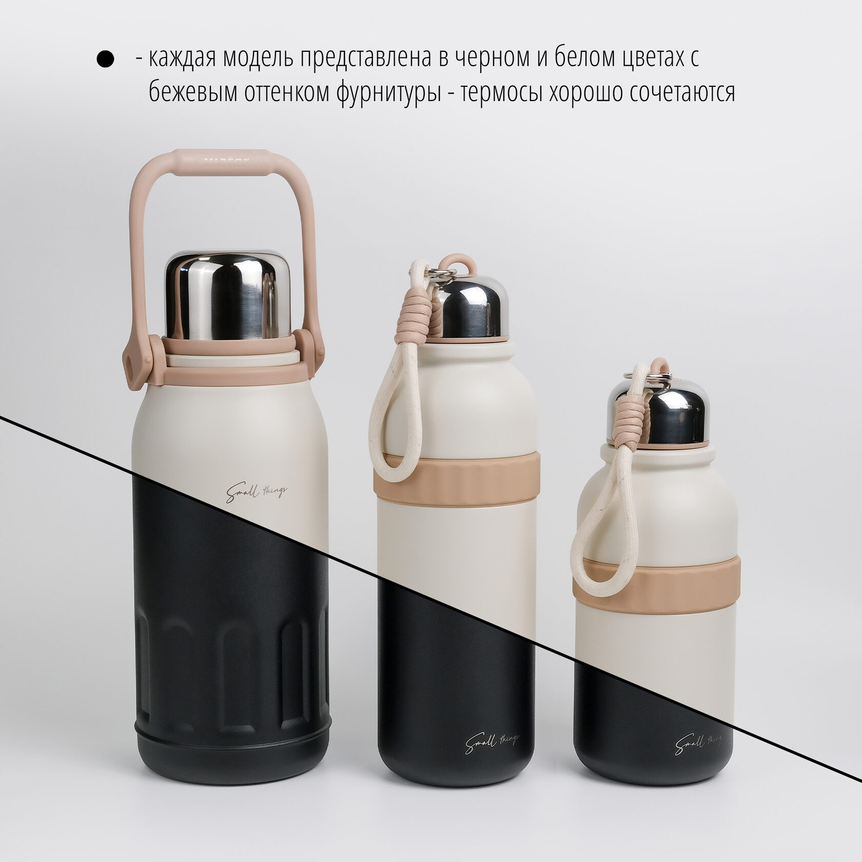 В серии есть термосы объемом 600, 850 и 1200 мл - можно выбрать удобный объем под ваши планы. Каждая модель представлена в черном и белом (молочном) цветах с одинаковым бежевым оттенком фурнитуры - термосы хорошо сочетаются между собой.
