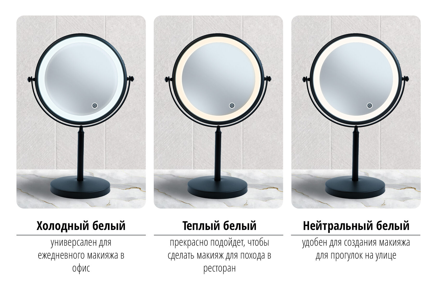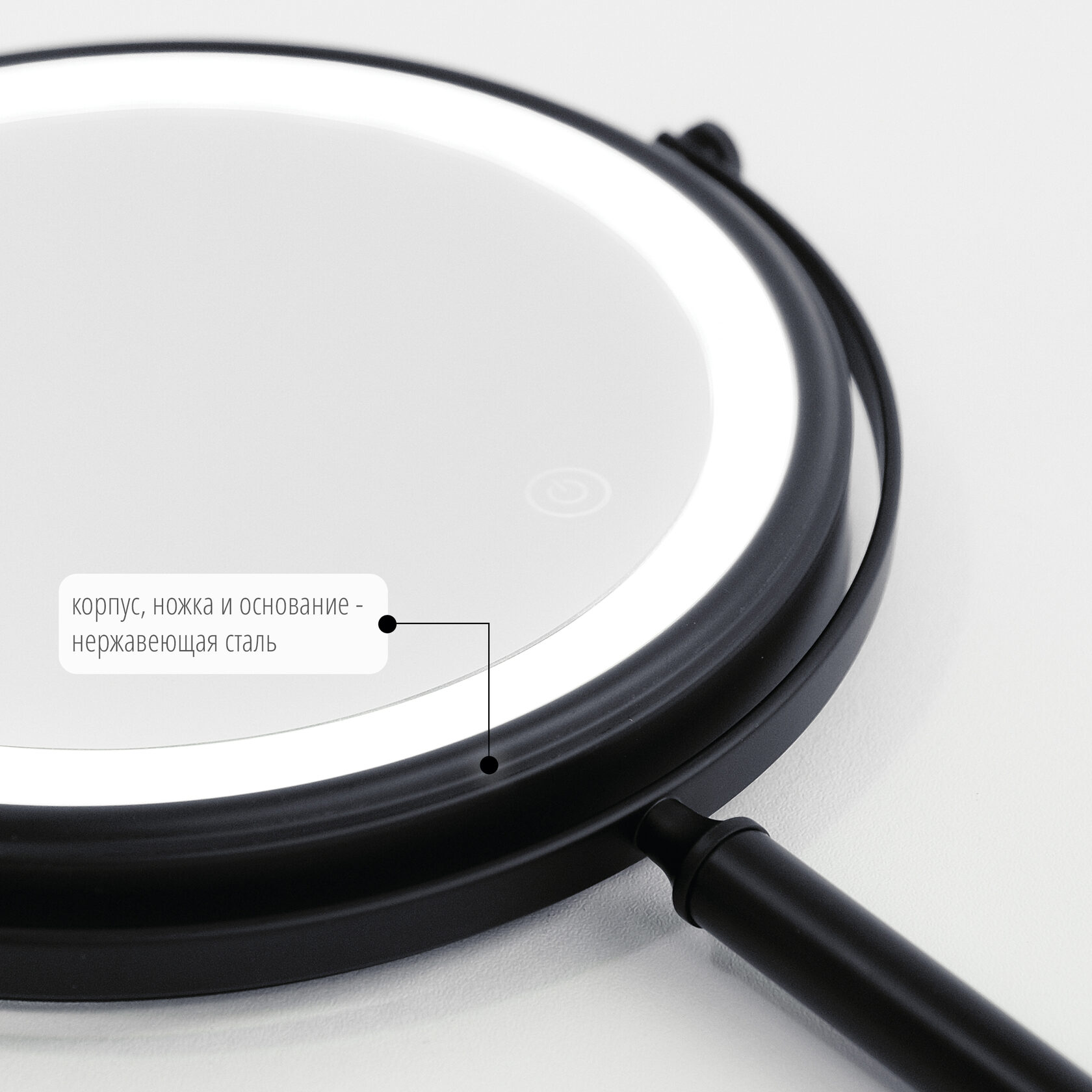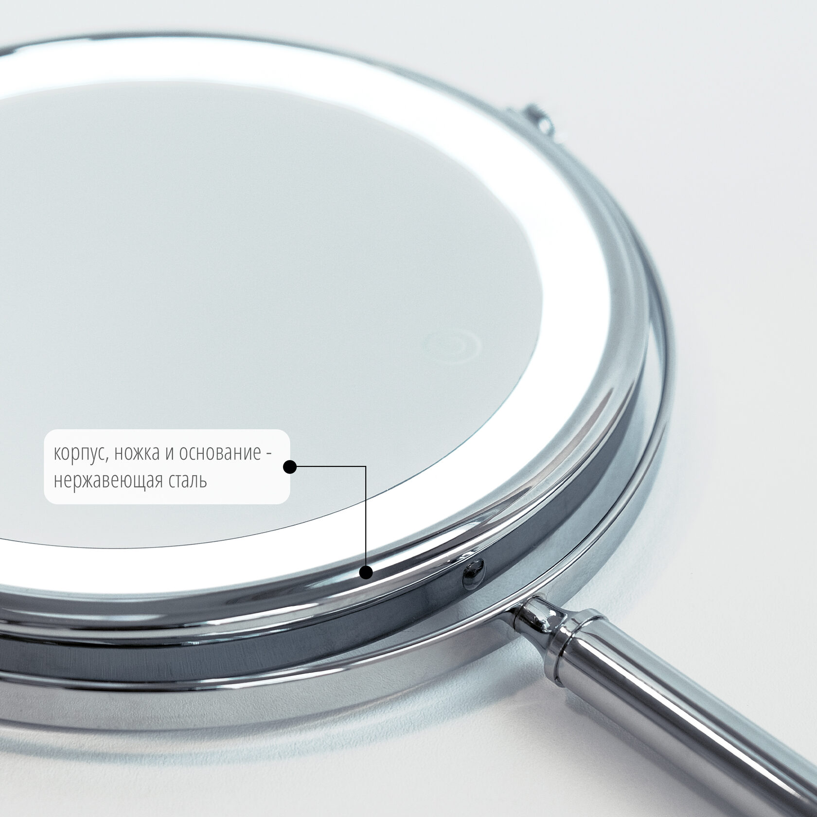Настольное двухстороннее зеркало со светодиодной подсветкой выполнено в простом и лаконичном дизайне. Оно оснащено круглым устойчивым основанием и мягкой подложкой внизу для защиты поверхности стола и бесшумного перемещения зеркала. Одна сторона представляет собой обычное зеркало без увеличения, а другая сторона - зеркало с 3-кратным увеличением.