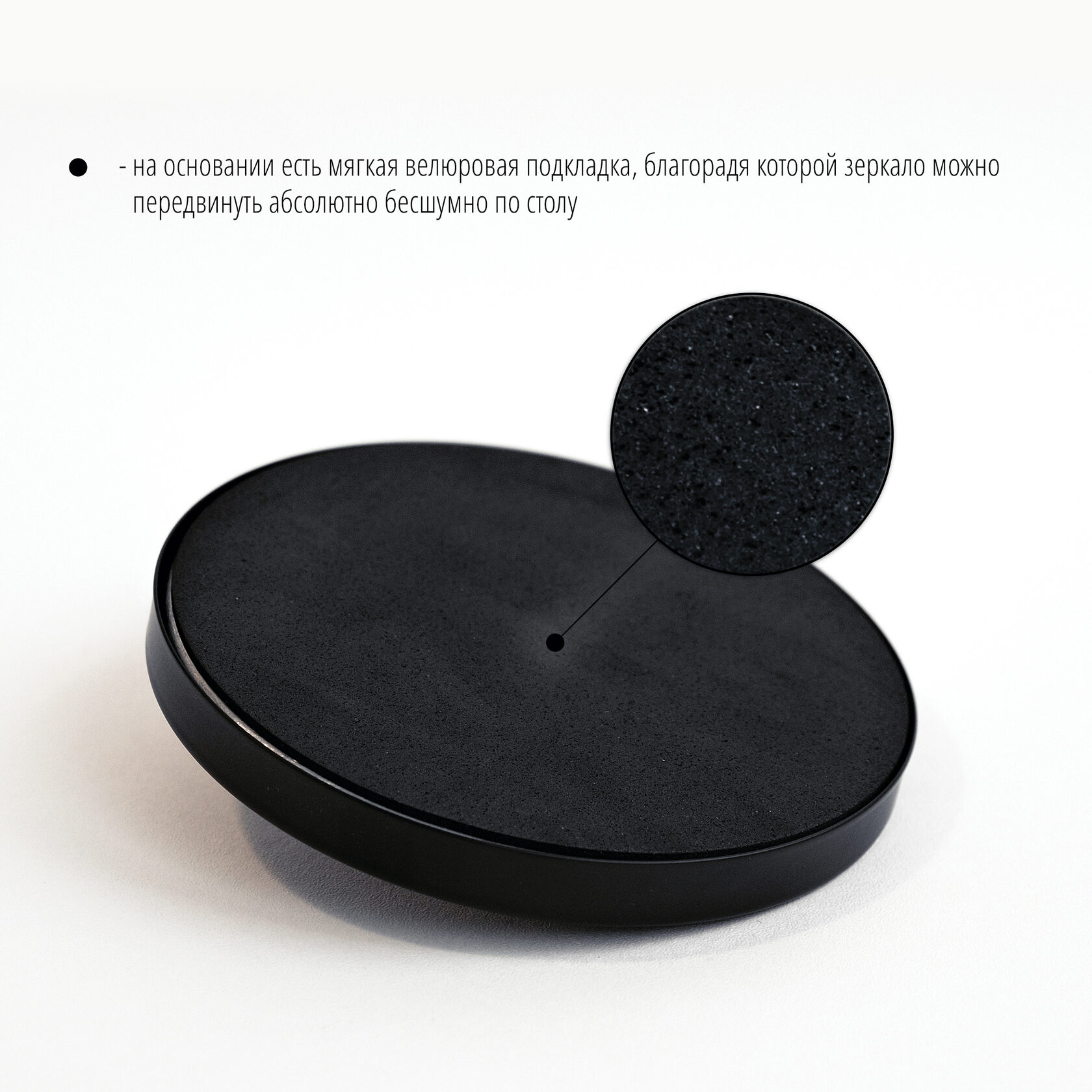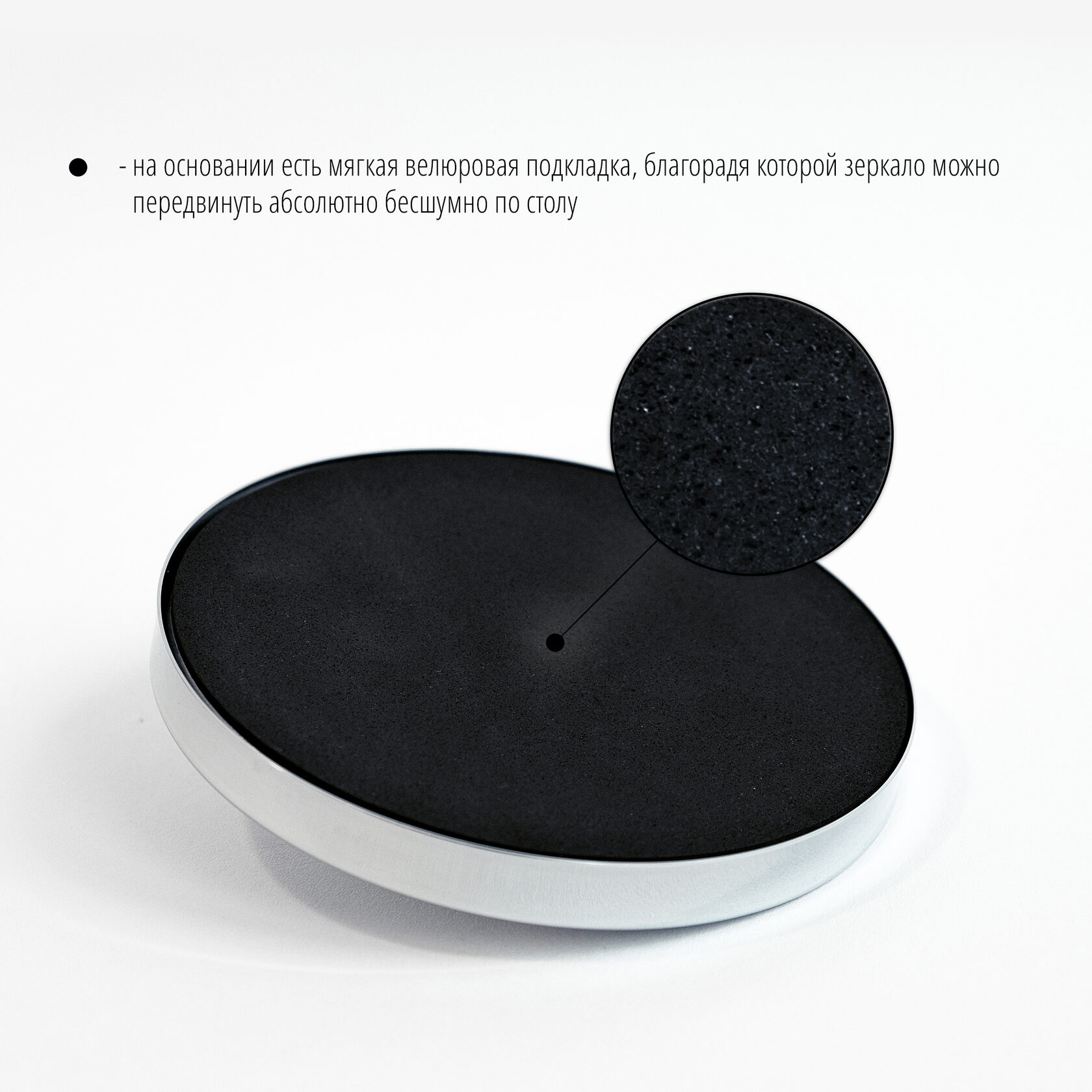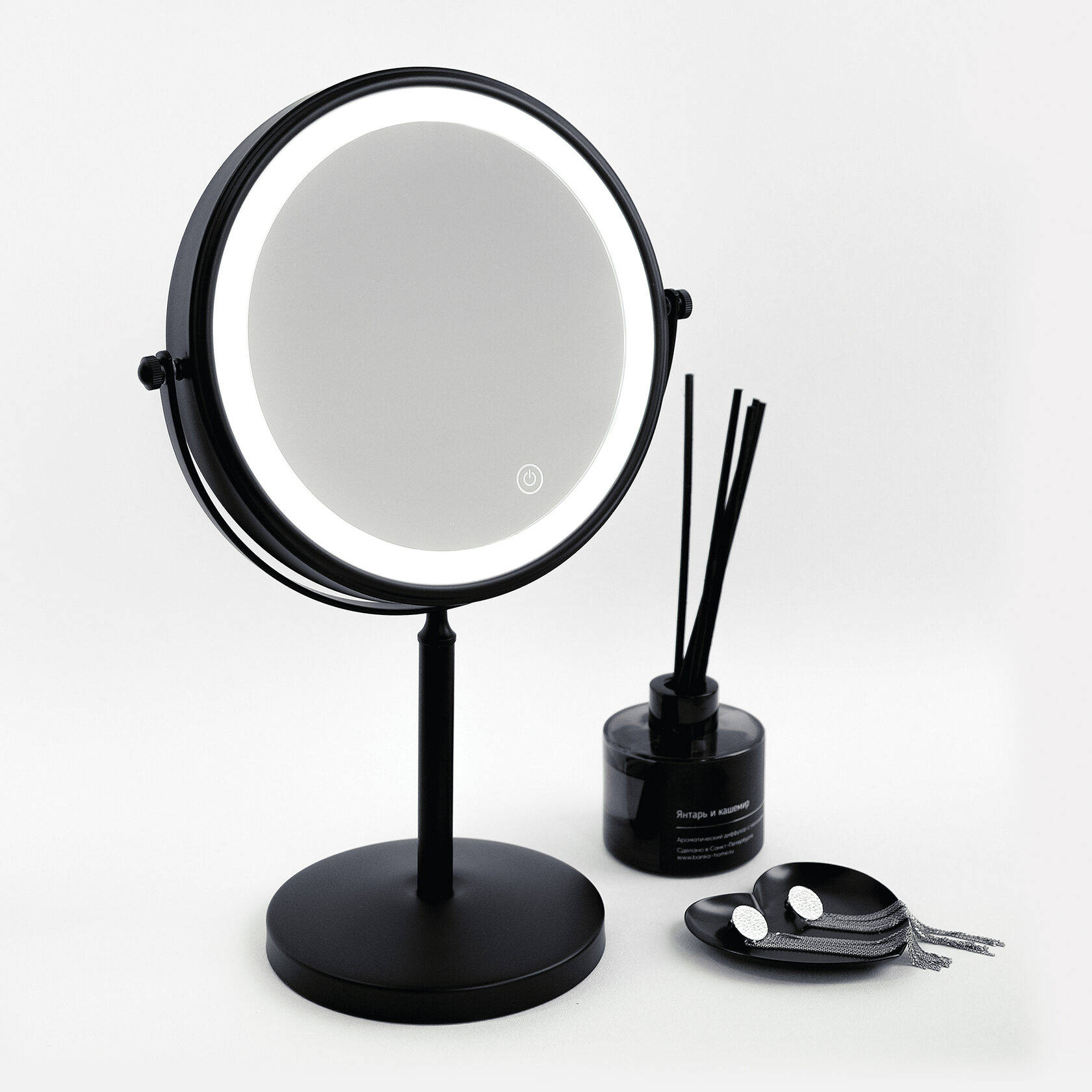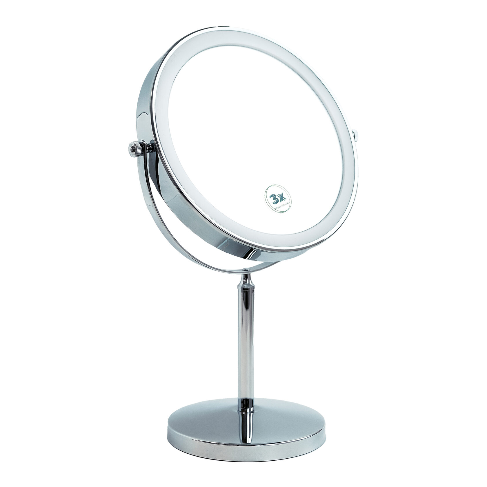 Настольное двухстороннее зеркало со светодиодной подсветкой выполнено в простом и лаконичном дизайне. Оно оснащено круглым устойчивым основанием и мягкой подложкой внизу для защиты поверхности стола и бесшумного перемещения зеркала. Одна сторона представляет собой обычное зеркало без увеличения, а другая сторона - зеркало с 3-кратным увеличением.