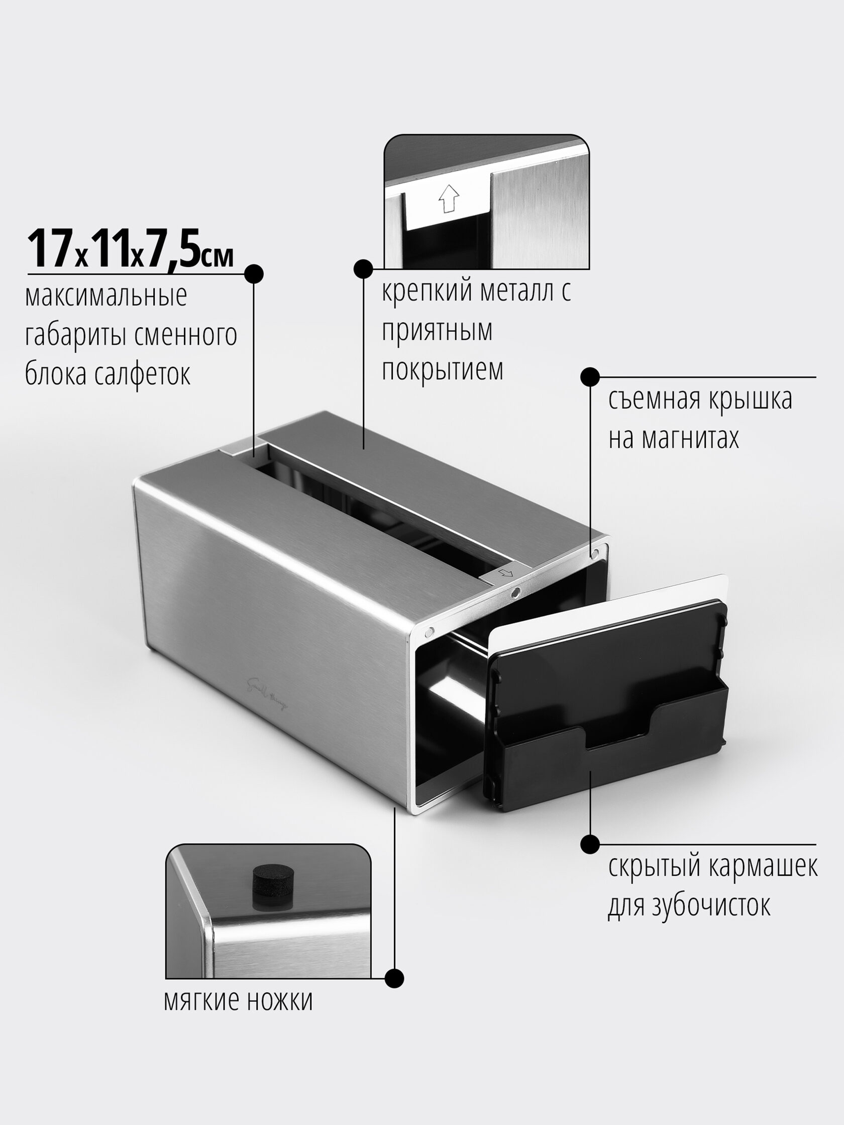 Сбоку салфетницы (на него указывает стрелка) есть магнитная откидная крышка с кармашком. Ее легко открыть, нажав изнутри через отверстие для салфеток и затем приподняв двумя пальцами. В кармашке можно хранить зубочистки.