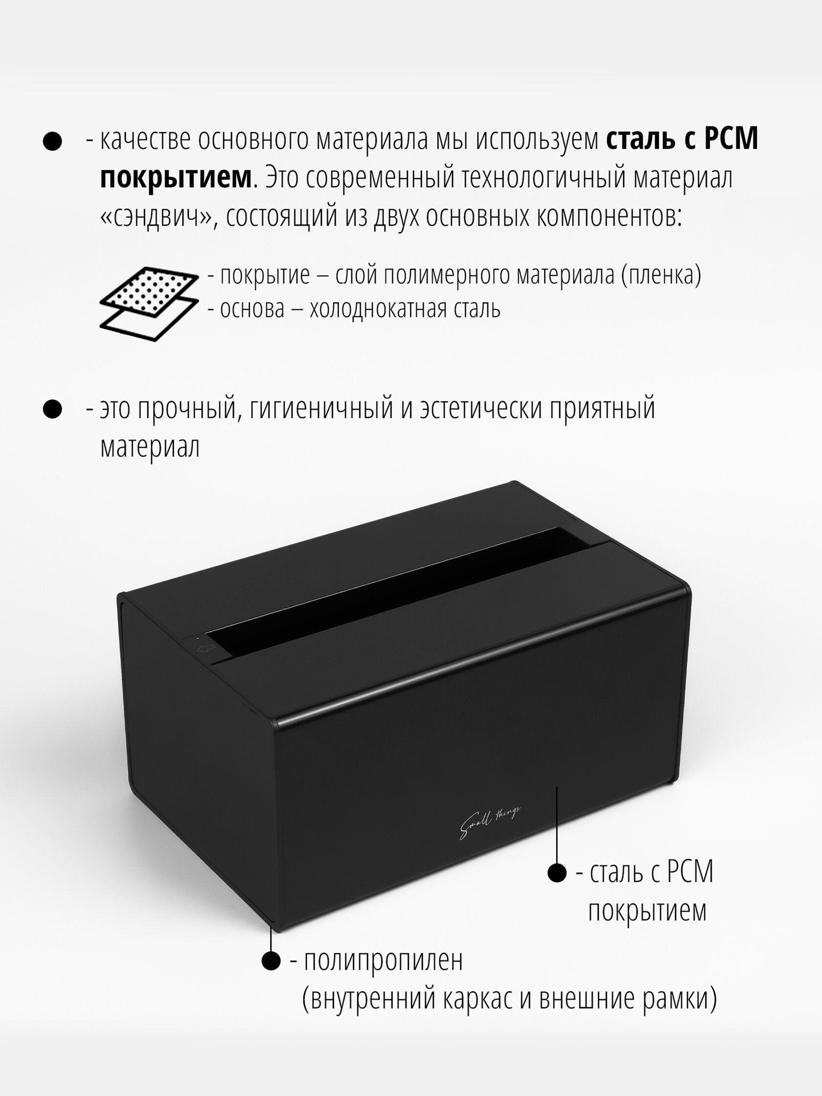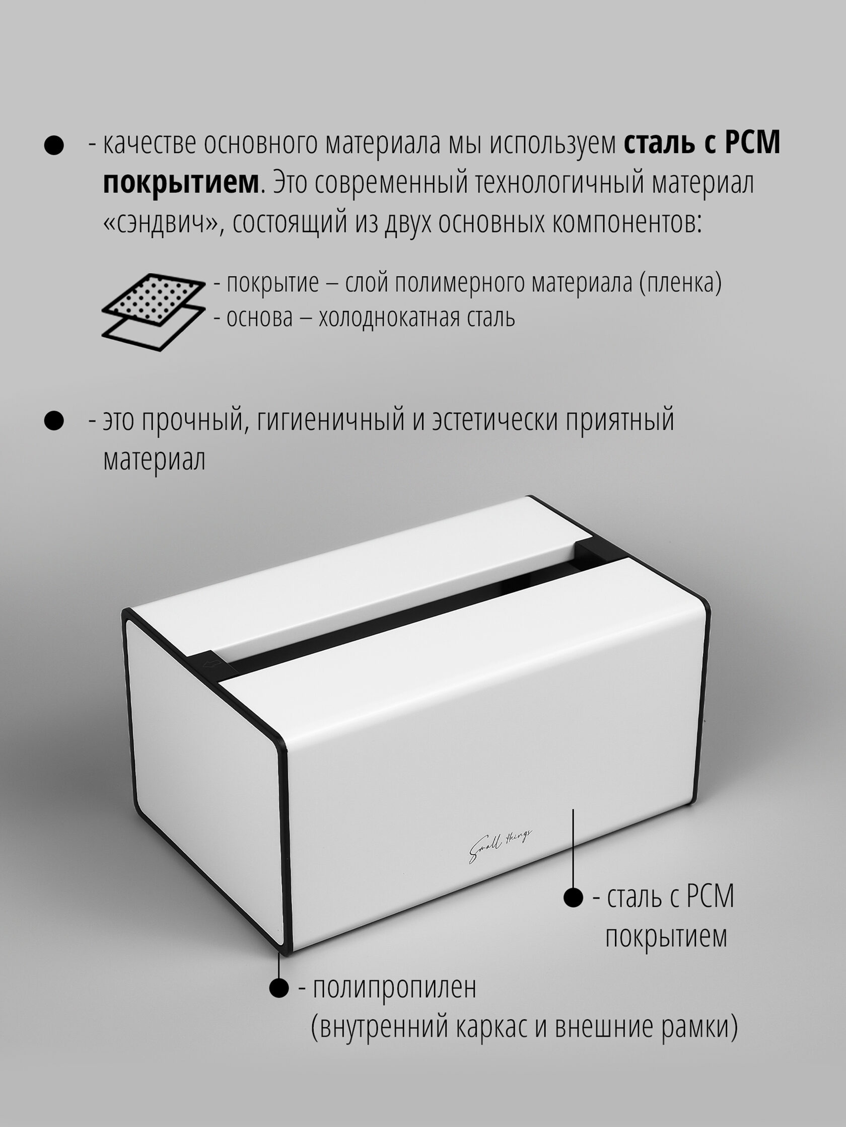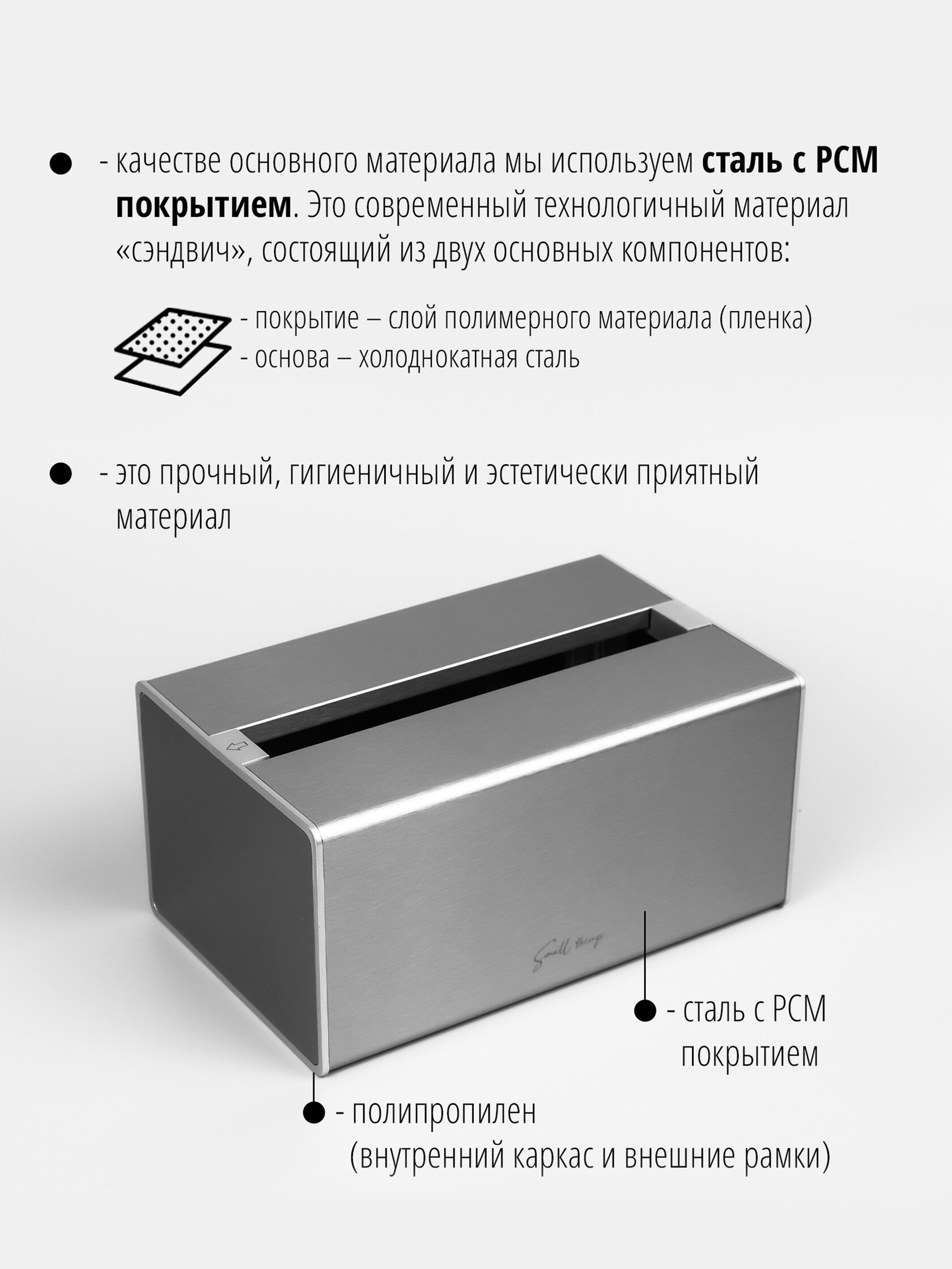 В качестве основного материала мы используем сталь с PCM покрытием. Это современный технологичный материал «сэндвич», состоящий из двух основных компонентов: