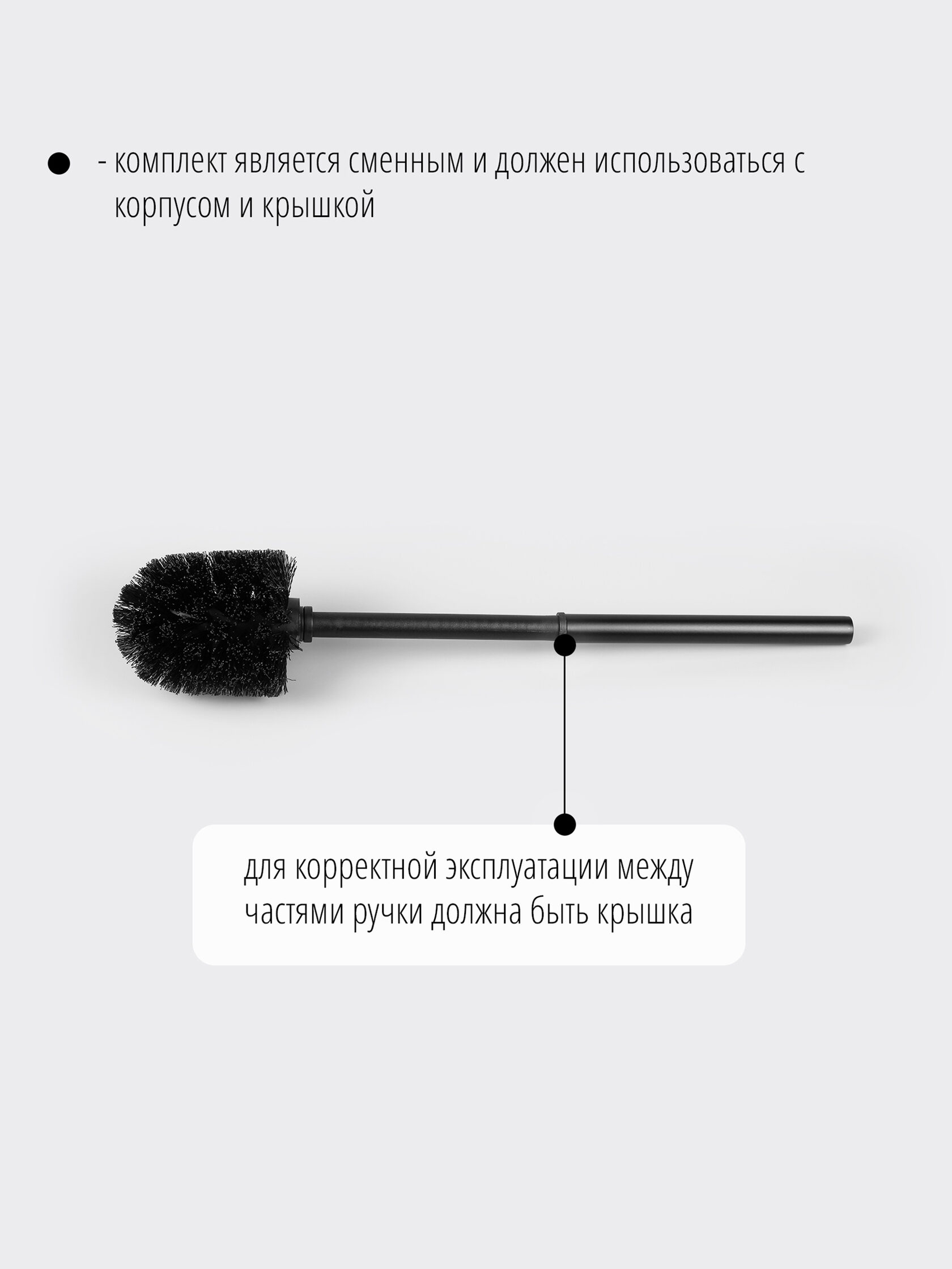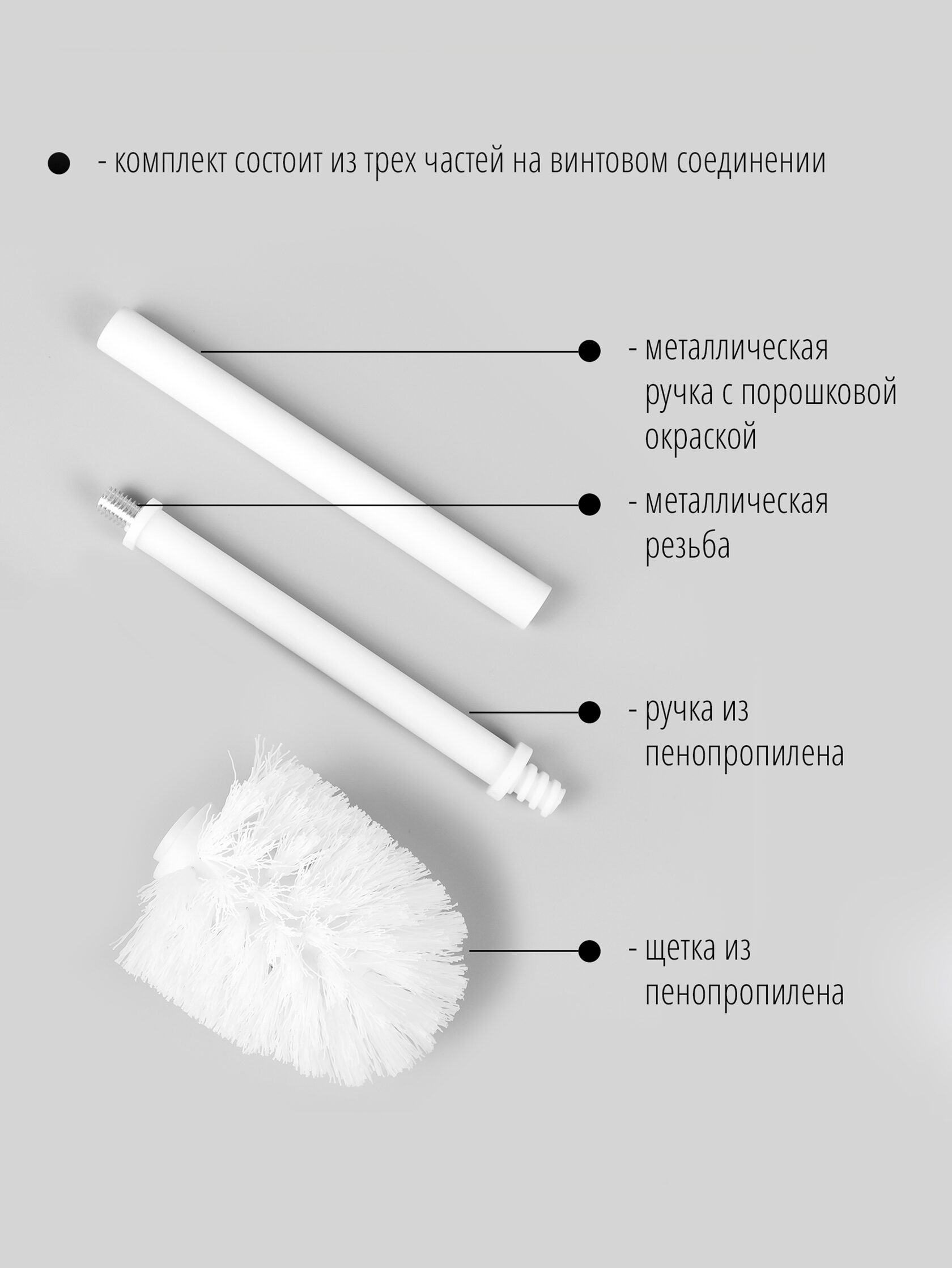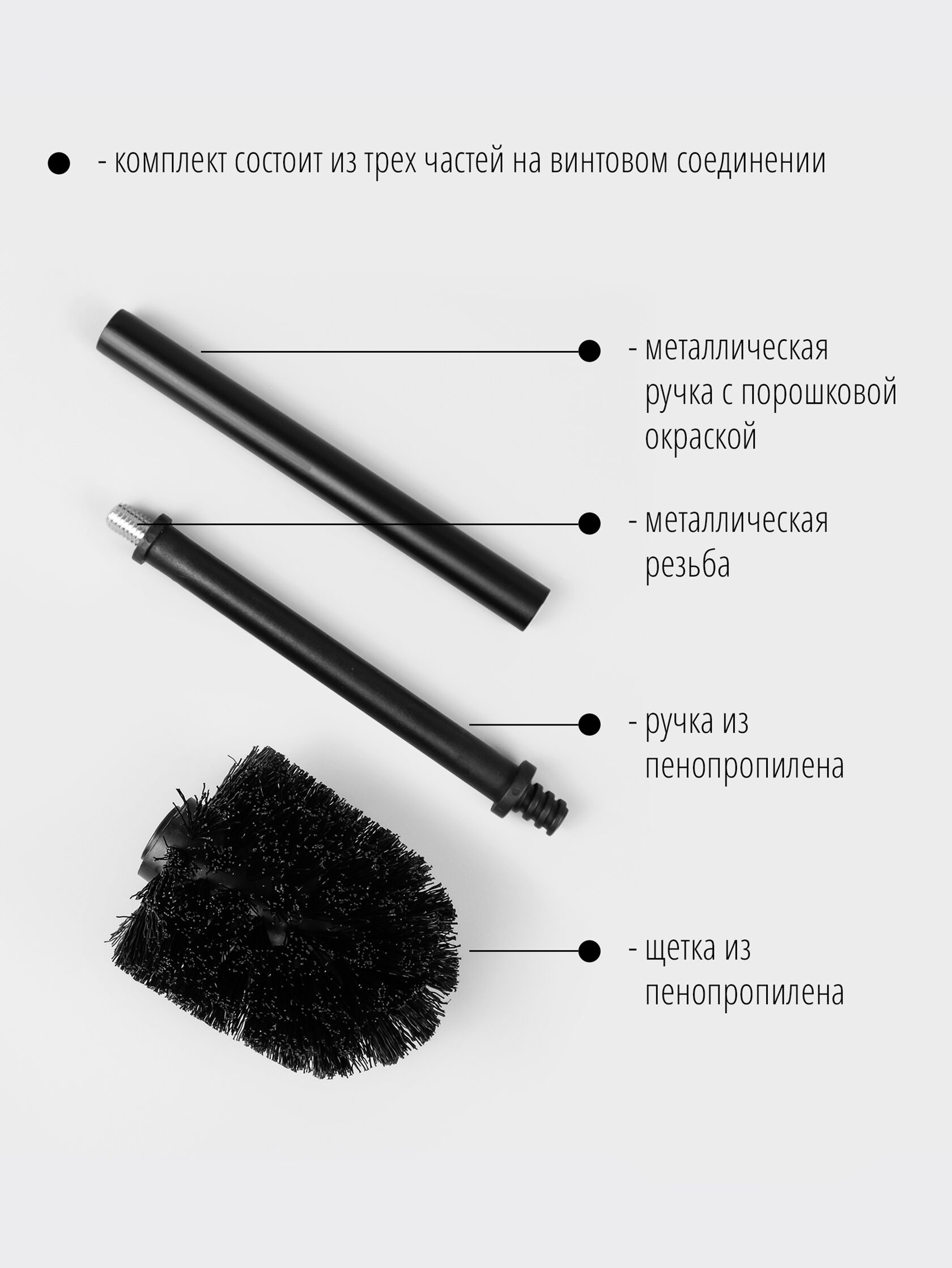 В комплекте: черная сменная щетка, пластиковая внутренняя ручка, внешняя металлическая ручка. Все три части соединяются винтовым соединением.