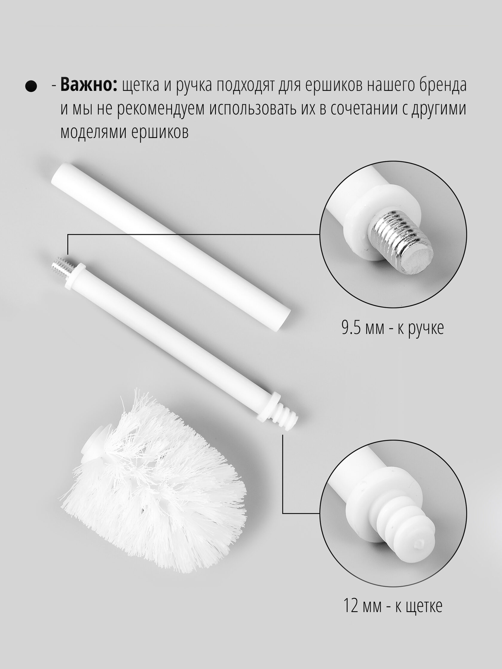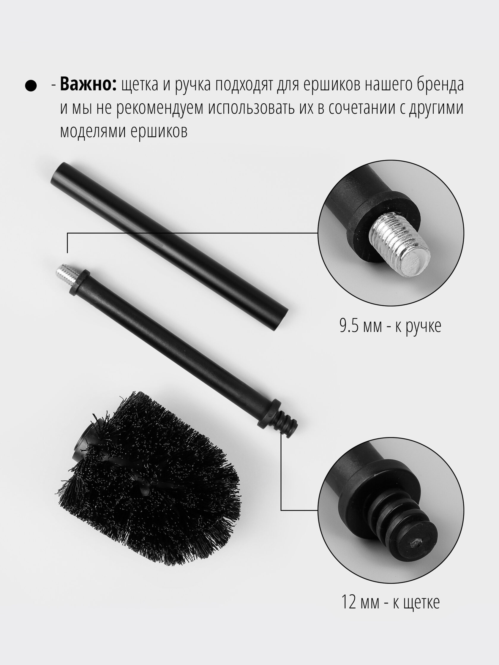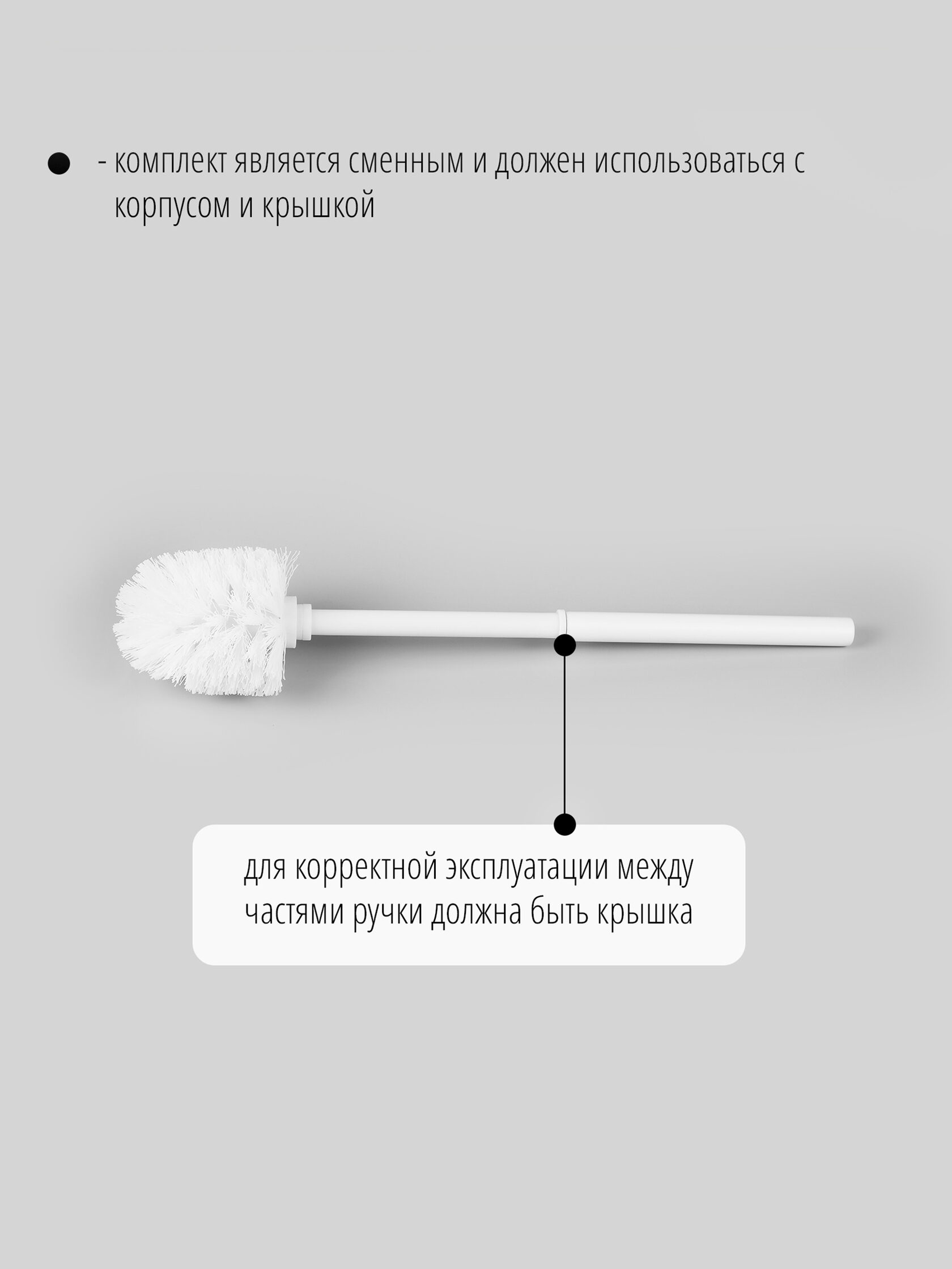 В комплекте: черная сменная щетка, пластиковая внутренняя ручка, внешняя металлическая ручка. Все три части соединяются винтовым соединением.