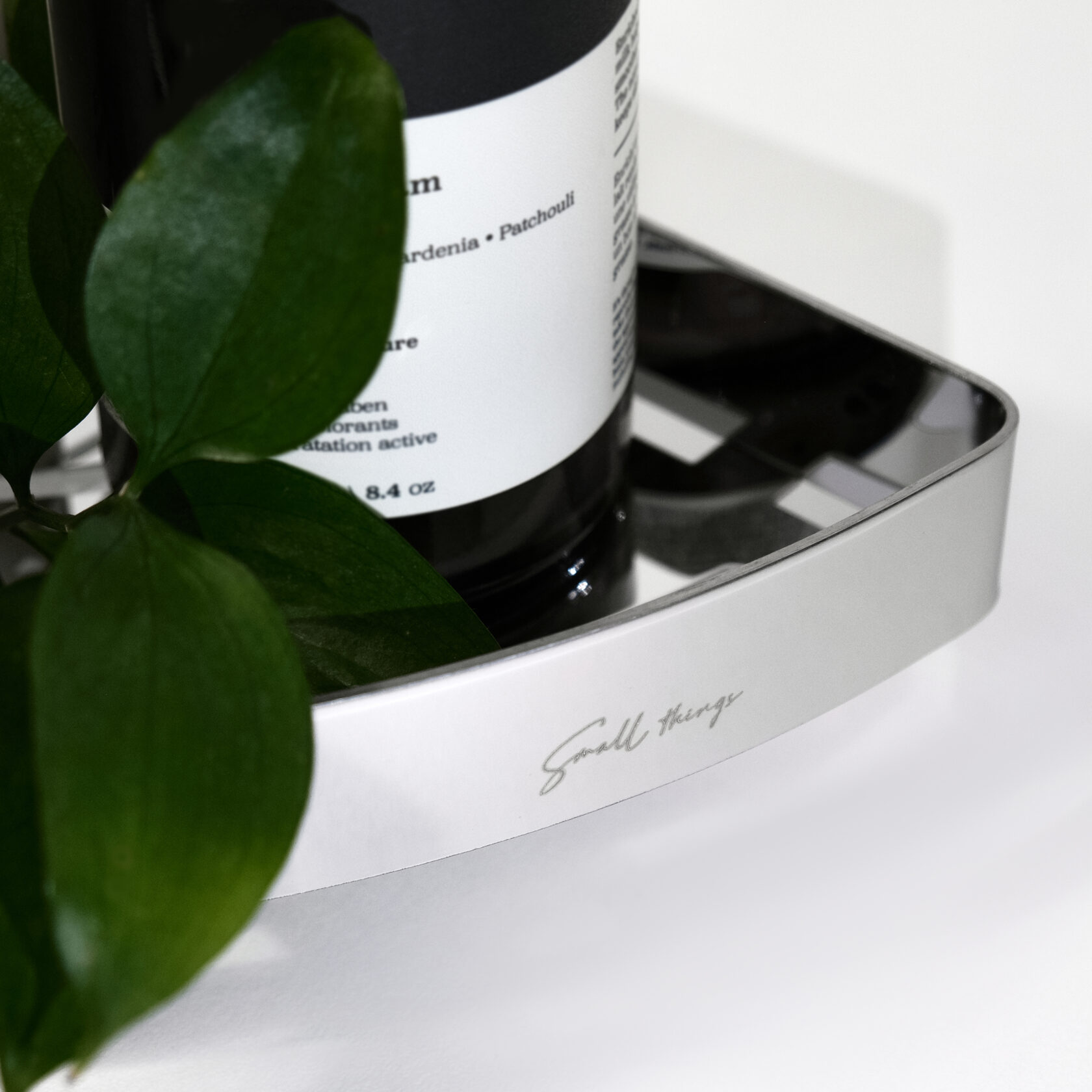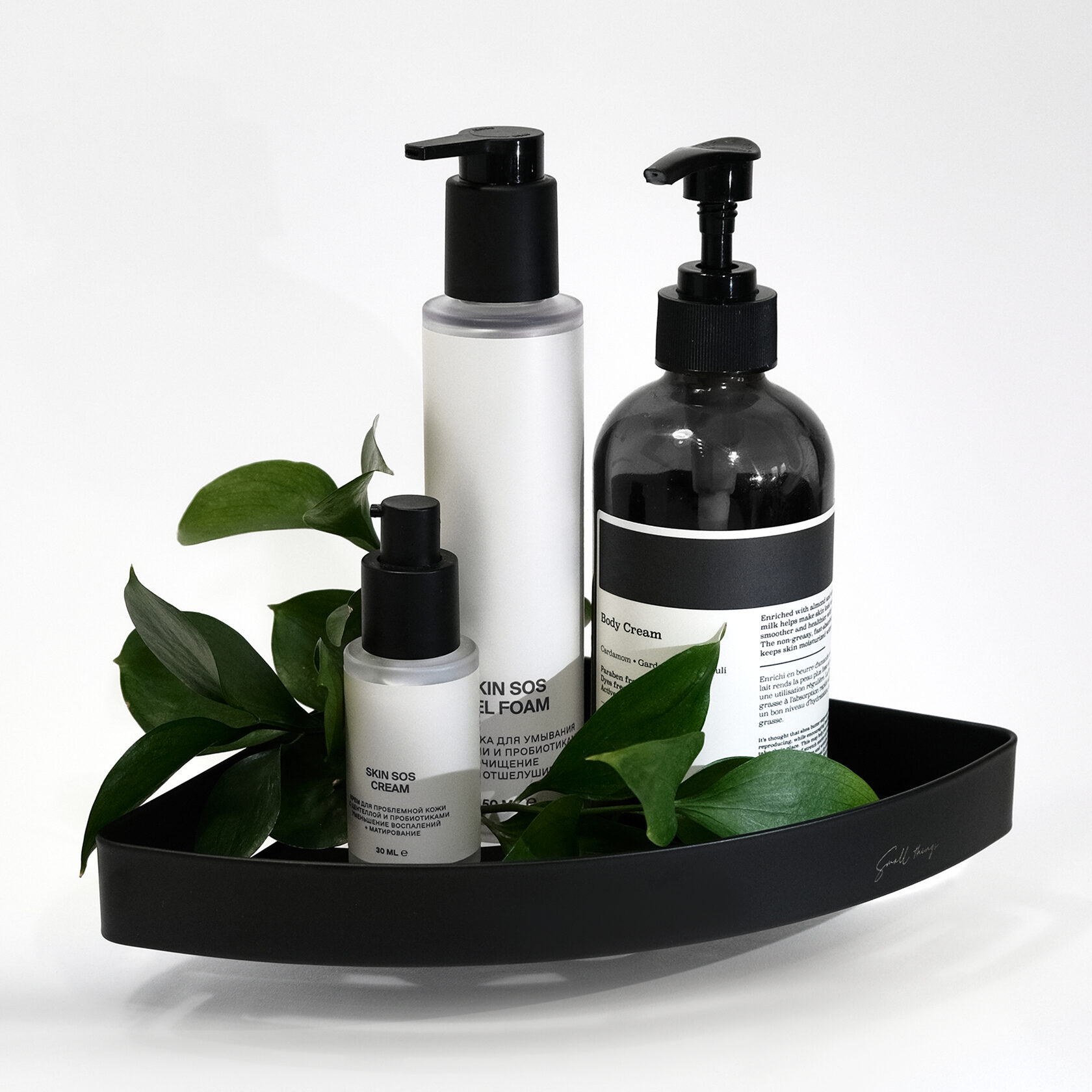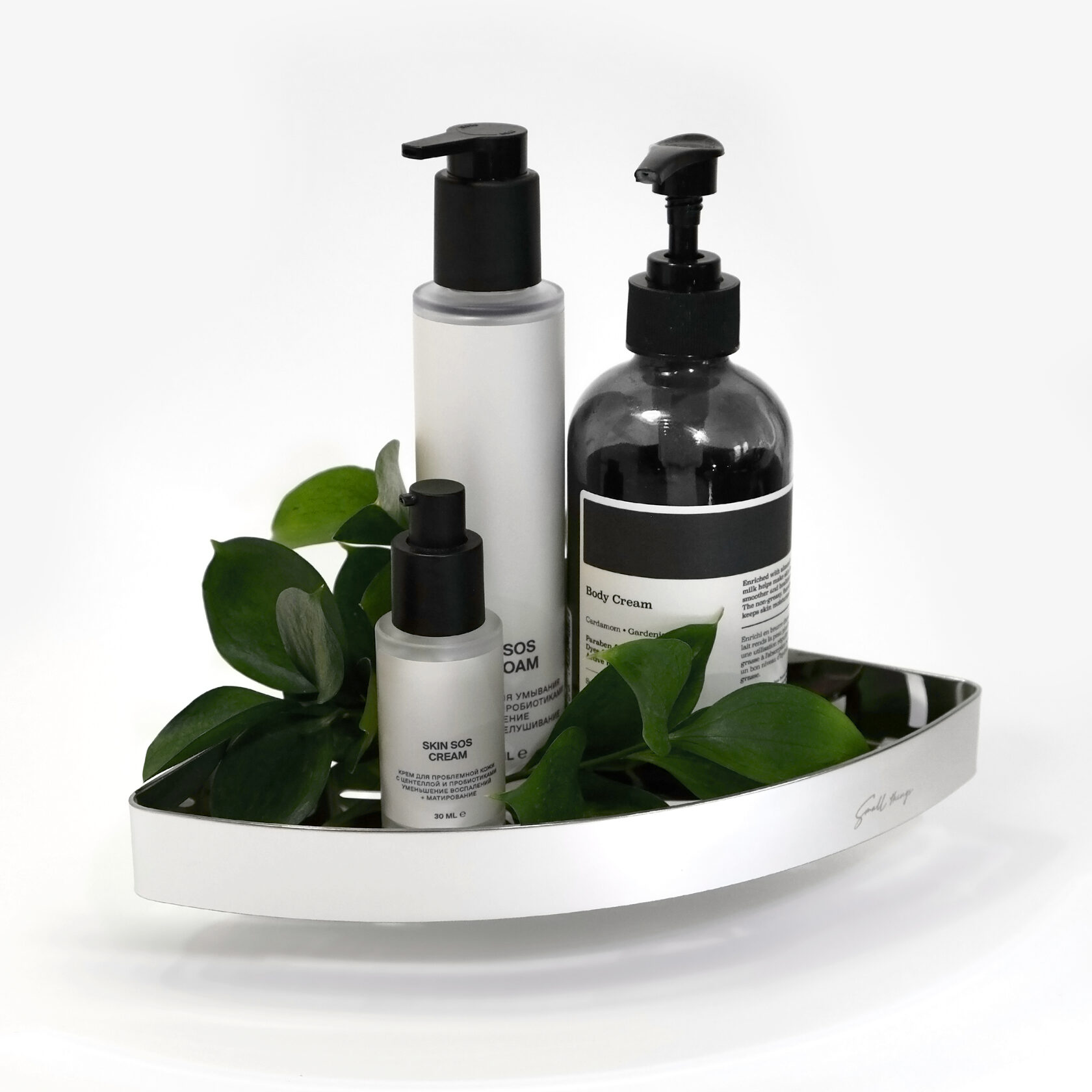Полка выполнена в минималистичном дизайне, за счет чего легко впишется в современный интерьер ванной комнаты, а бортики не дадут баночкам упасть.