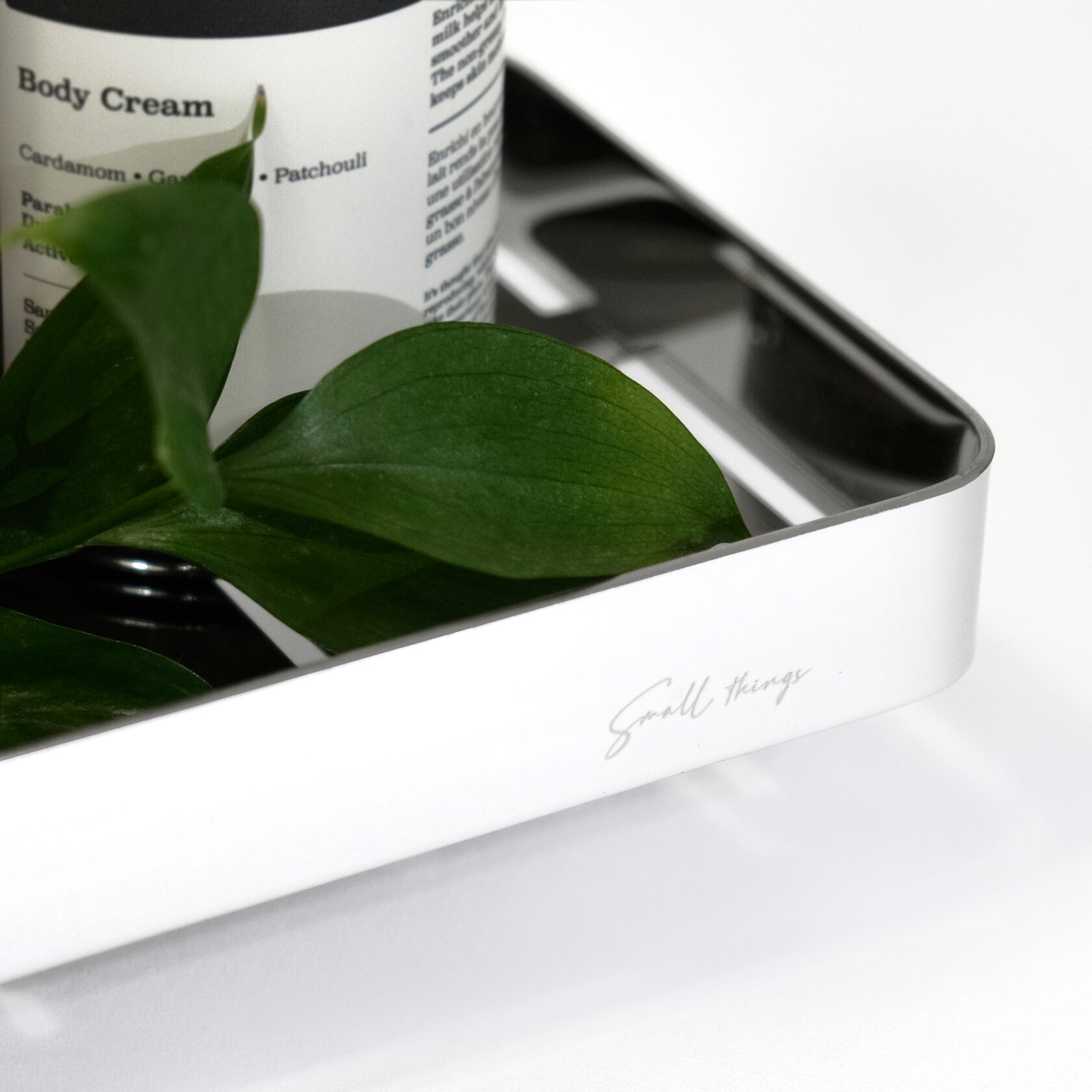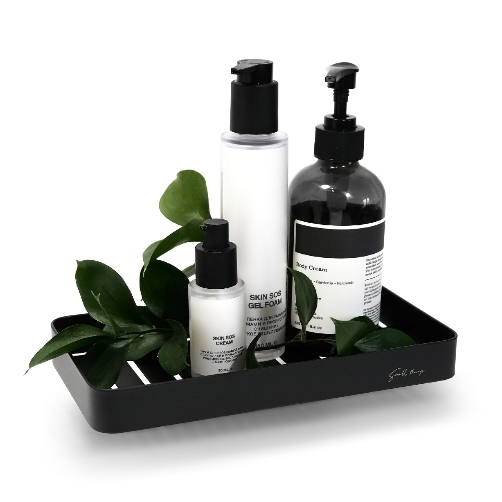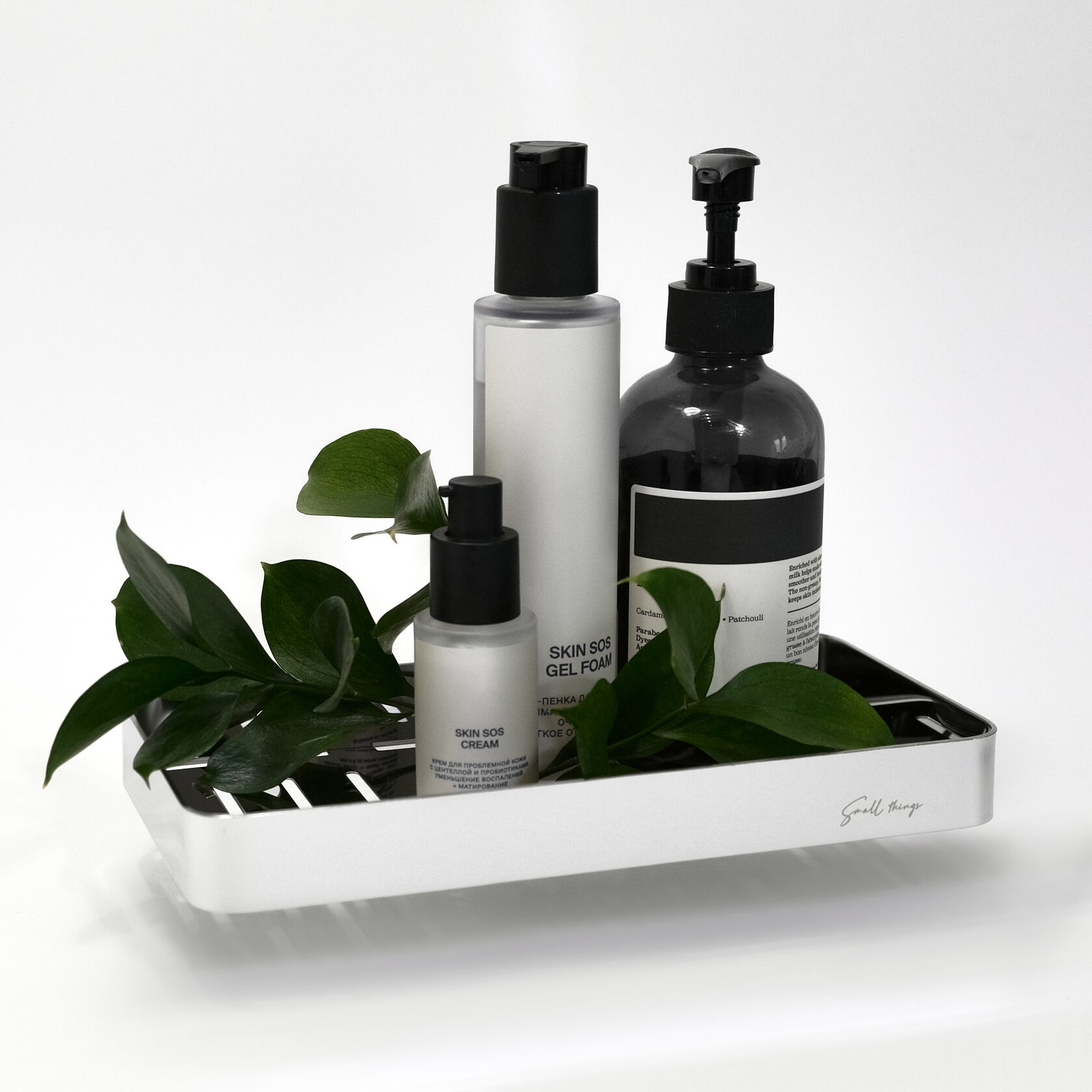 Полка выполнена в минималистичном дизайне, за счет чего легко впишется в современный интерьер ванной комнаты, а бортики не дадут баночкам упасть.