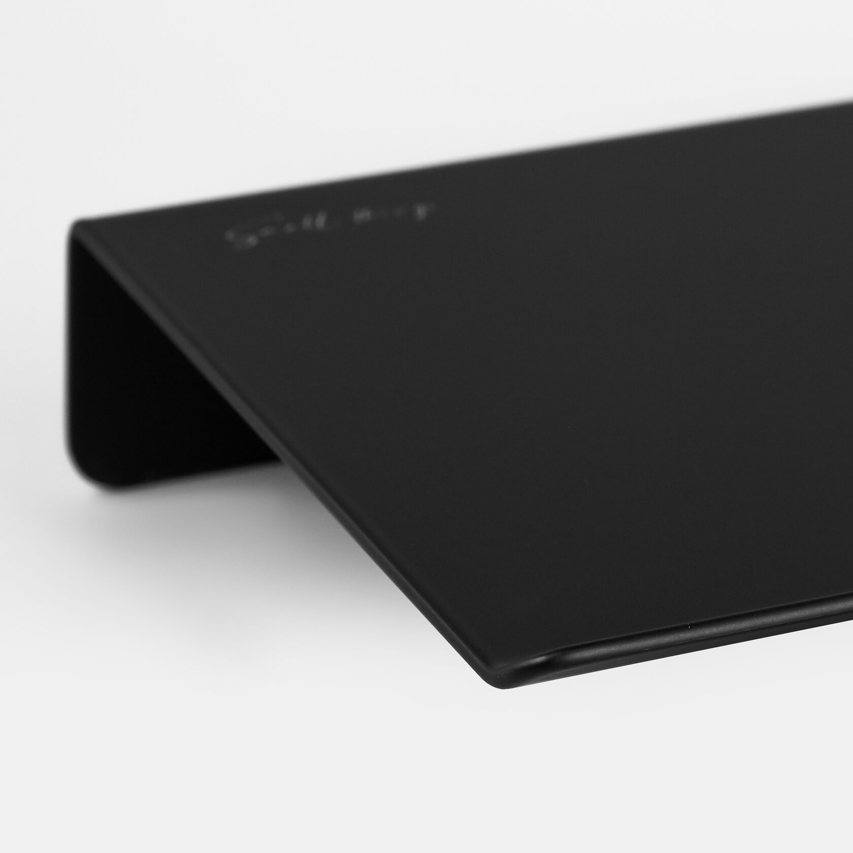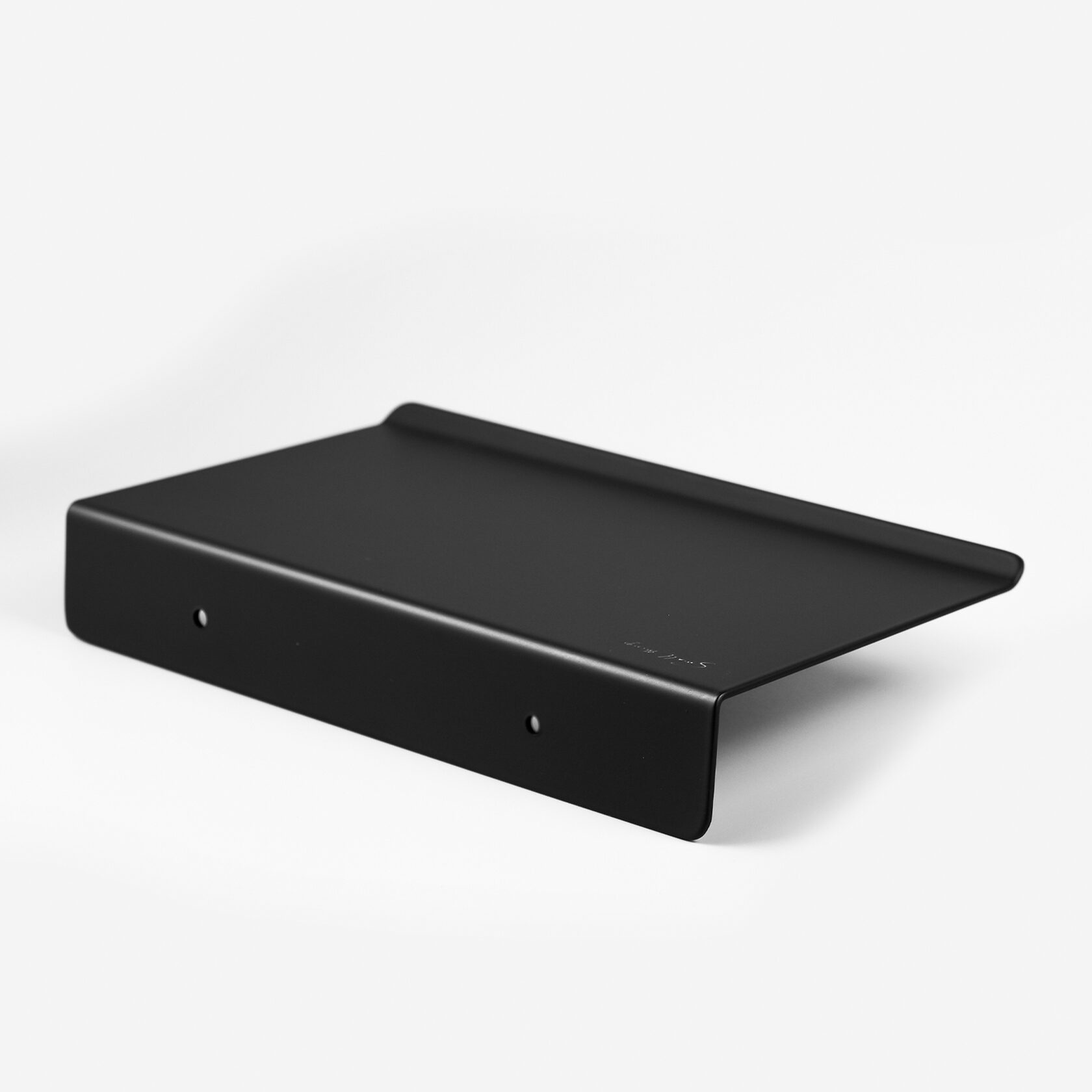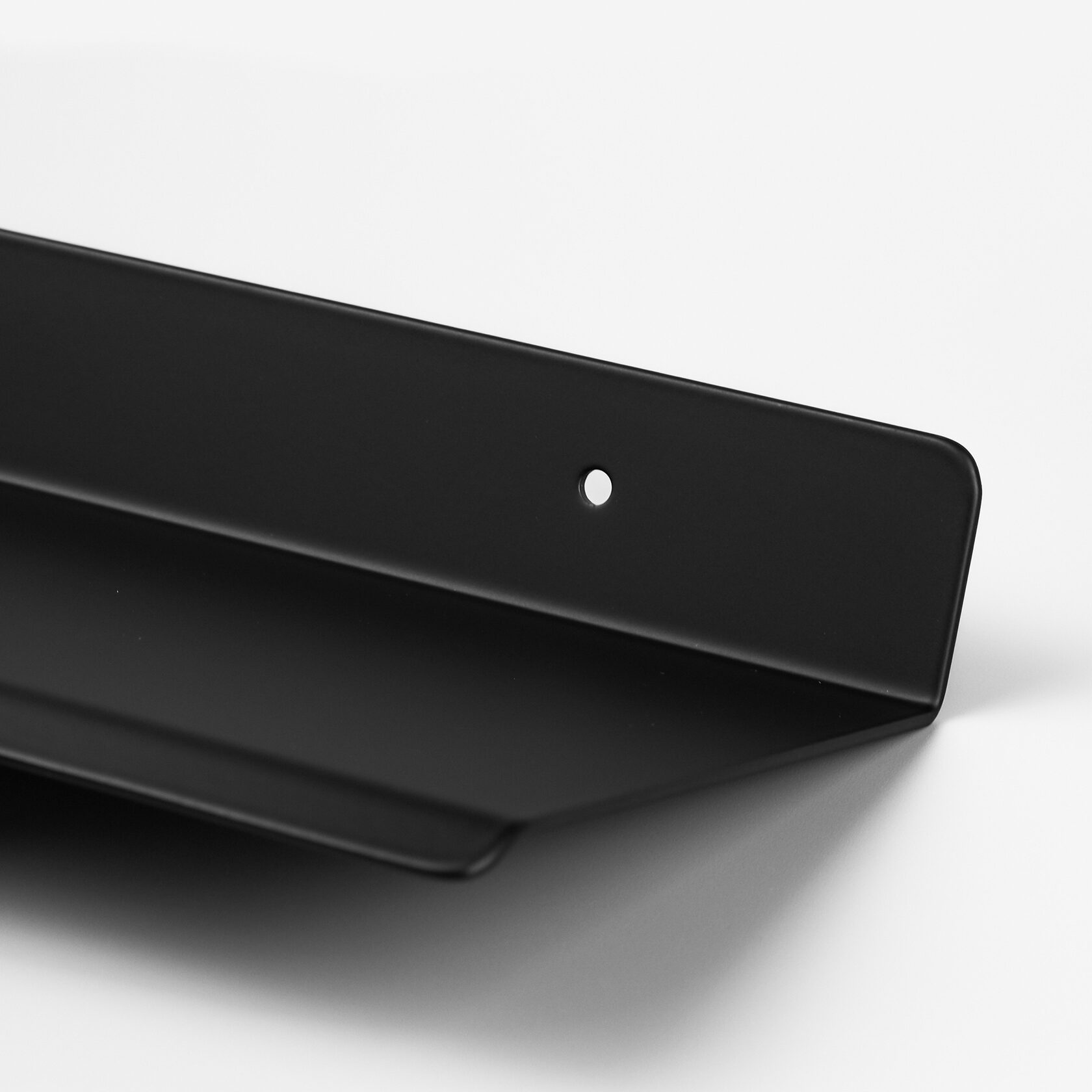 Прямая полка имеет скругленные углы и край с небольшим загибом, матовое черное покрытие, приятное на ощупь.