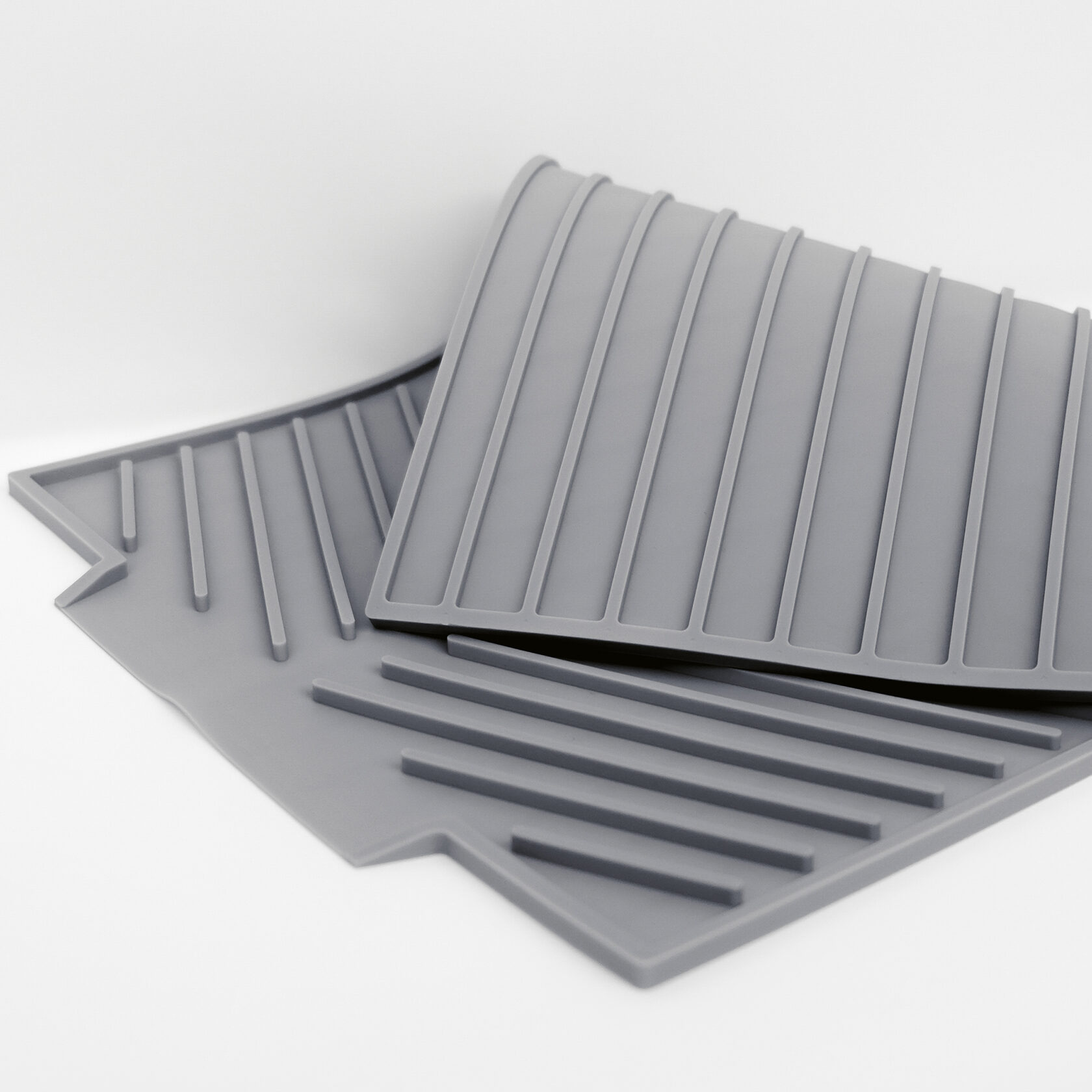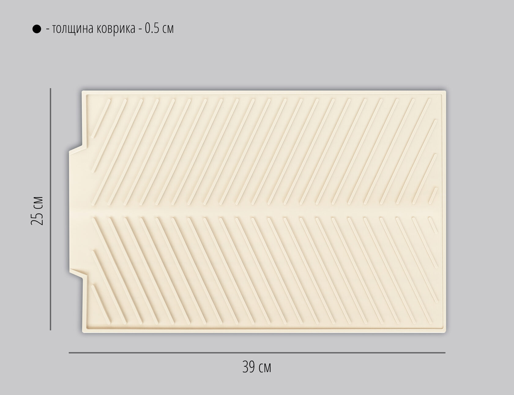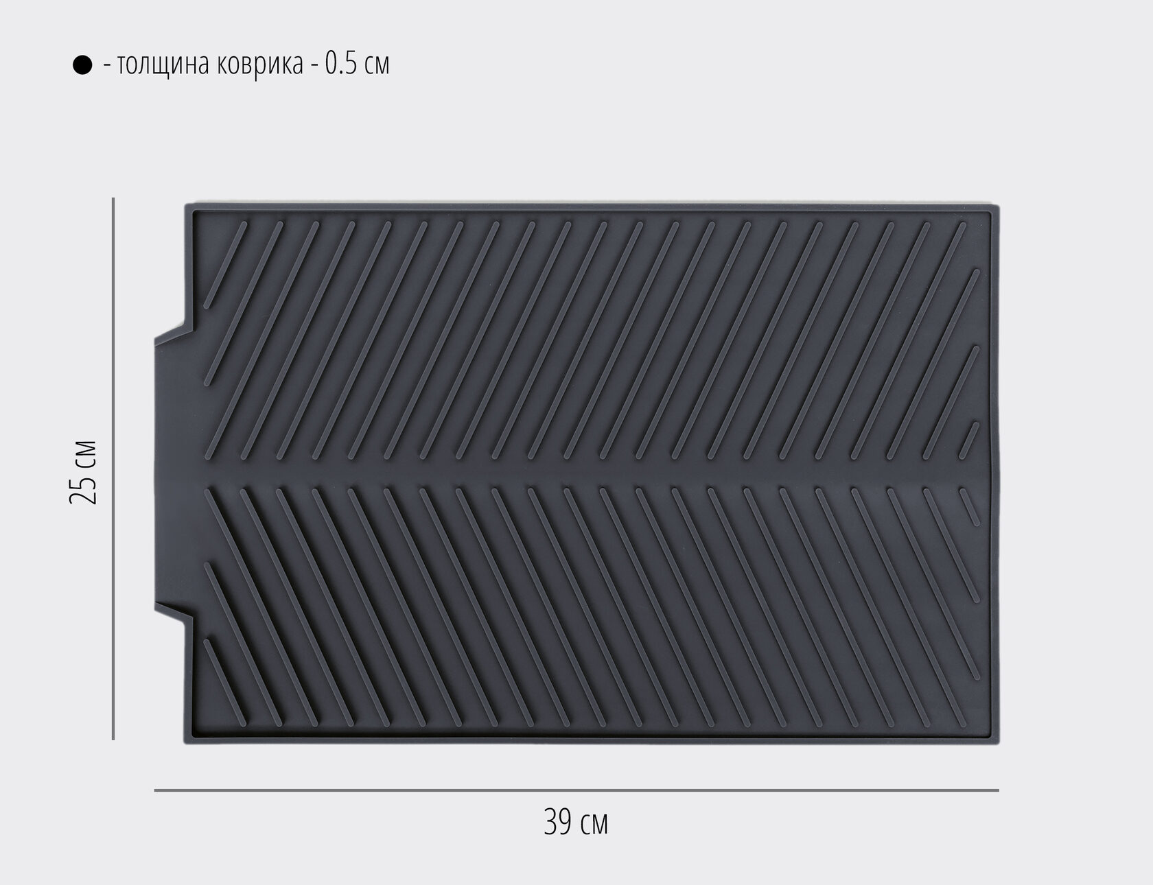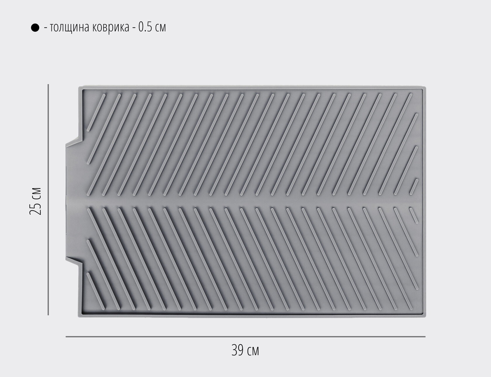 Коврик имеет 2 стороны с разным рисунком: - сторона с диагональными линиями оптимальна для сушки посуды или овощей - сторона с длинными линиями подойдет для использования как амортизация для кухонной доски Одна сторона коврика имеет уклон для направления воды в раковину при сушке посуды, а вторая сторона будет удерживать в себе влагу в уклоне (это удобно, если вы используете коврик вдали от раковины - вода не прольется).