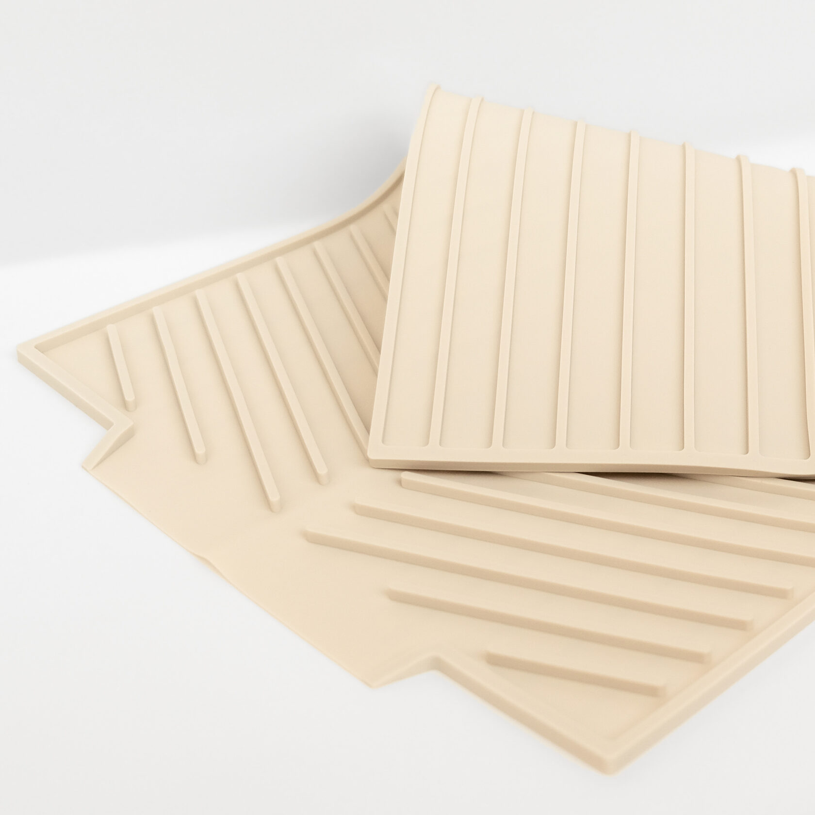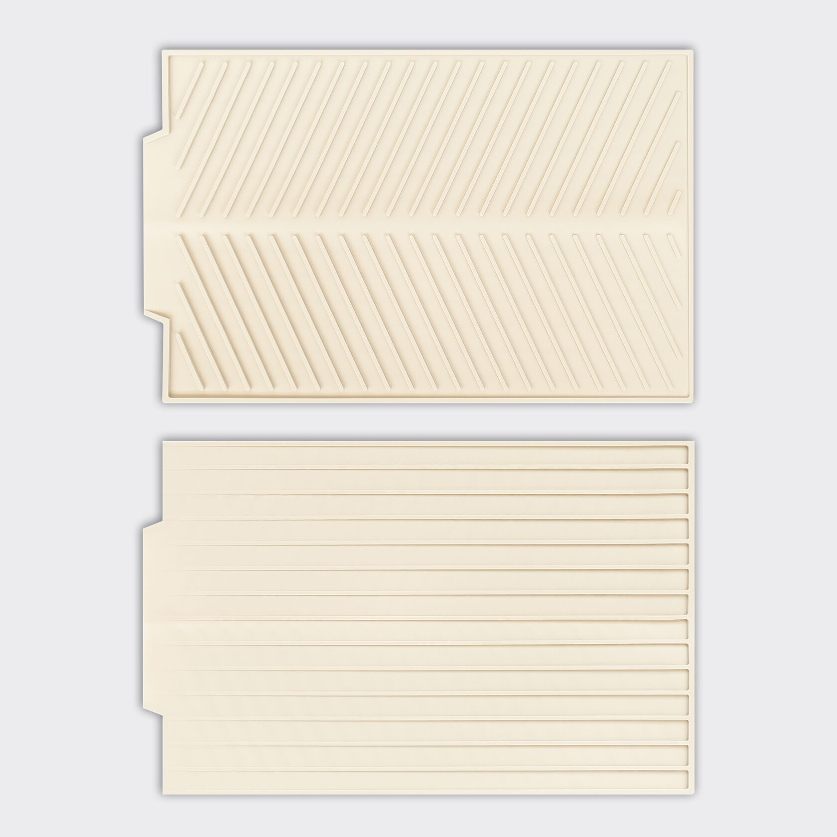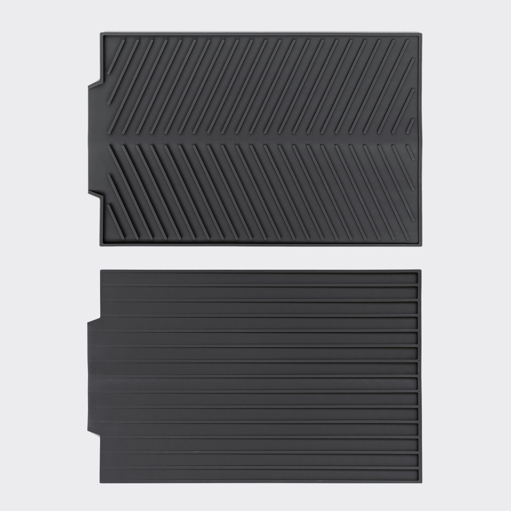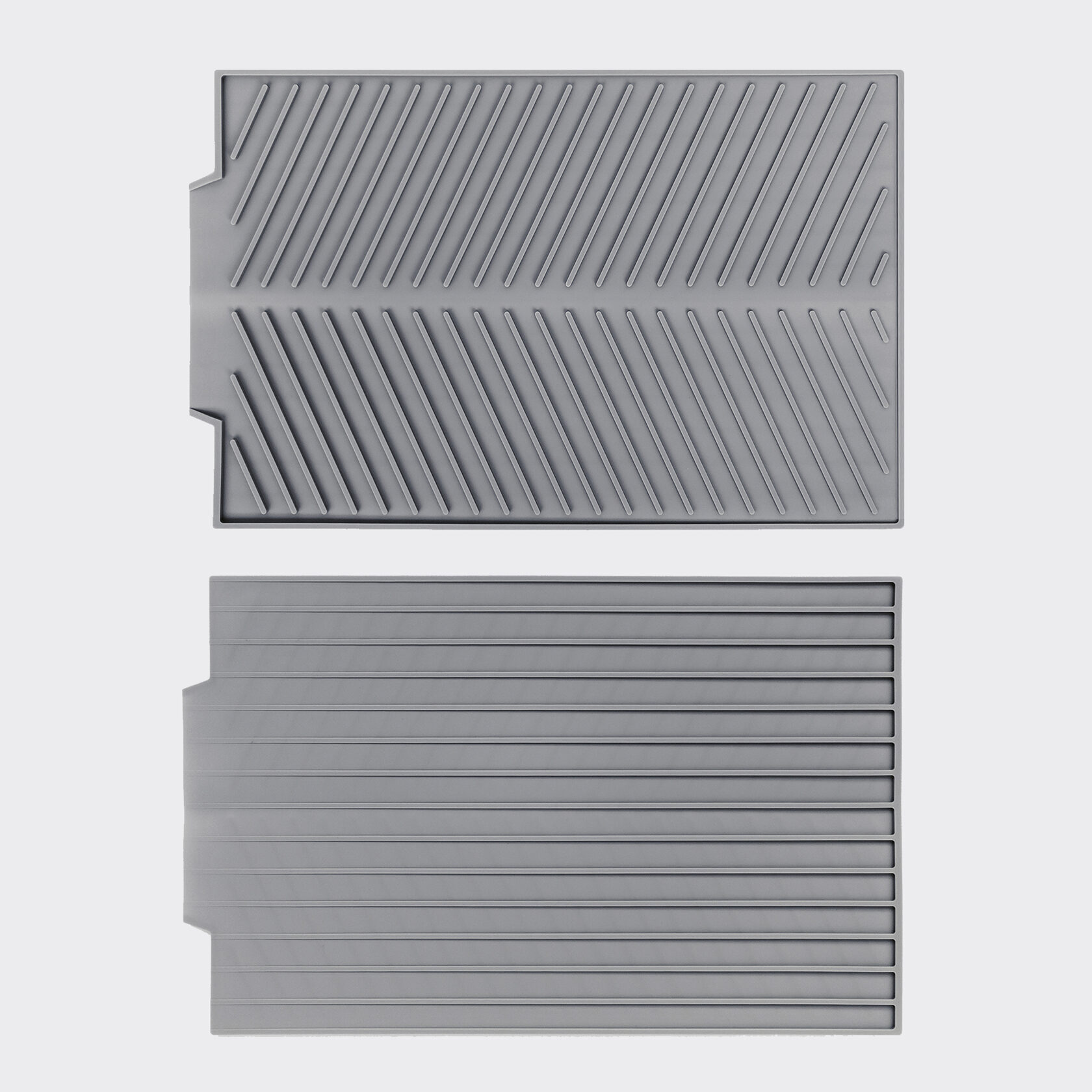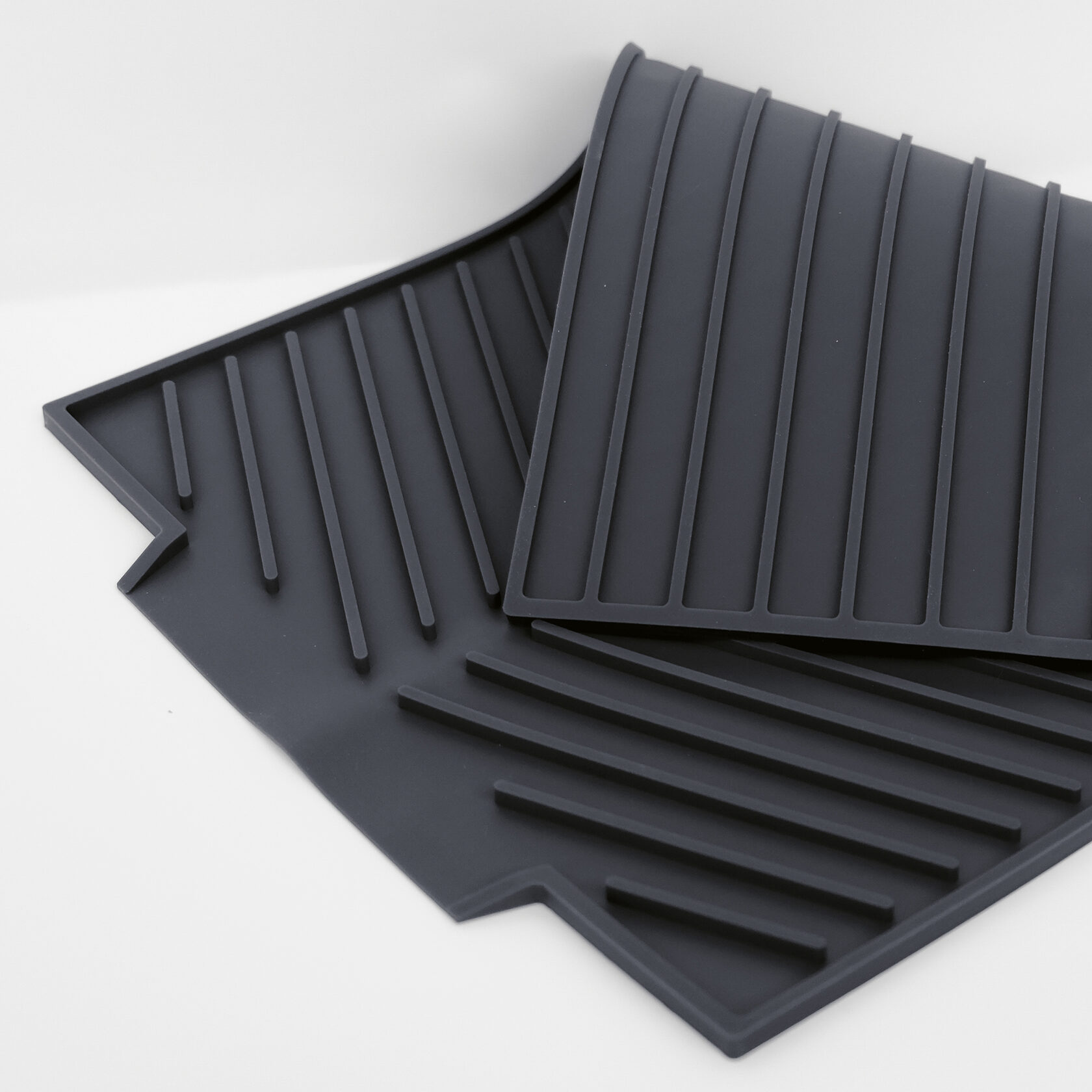 Коврик имеет 2 стороны с разным рисунком: - сторона с диагональными линиями оптимальна для сушки посуды или овощей - сторона с длинными линиями подойдет для использования как амортизация для кухонной доски Одна сторона коврика имеет уклон для направления воды в раковину при сушке посуды, а вторая сторона будет удерживать в себе влагу в уклоне (это удобно, если вы используете коврик вдали от раковины - вода не прольется).