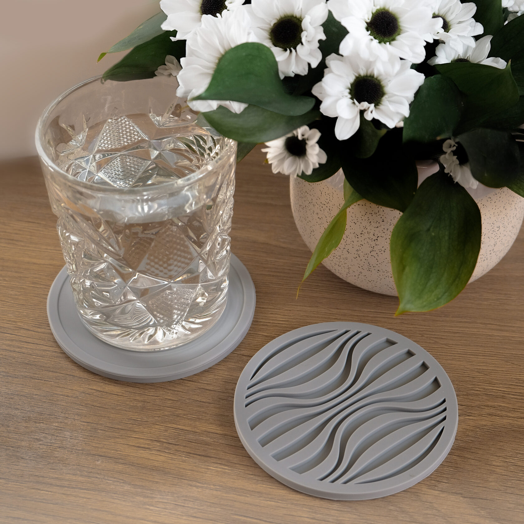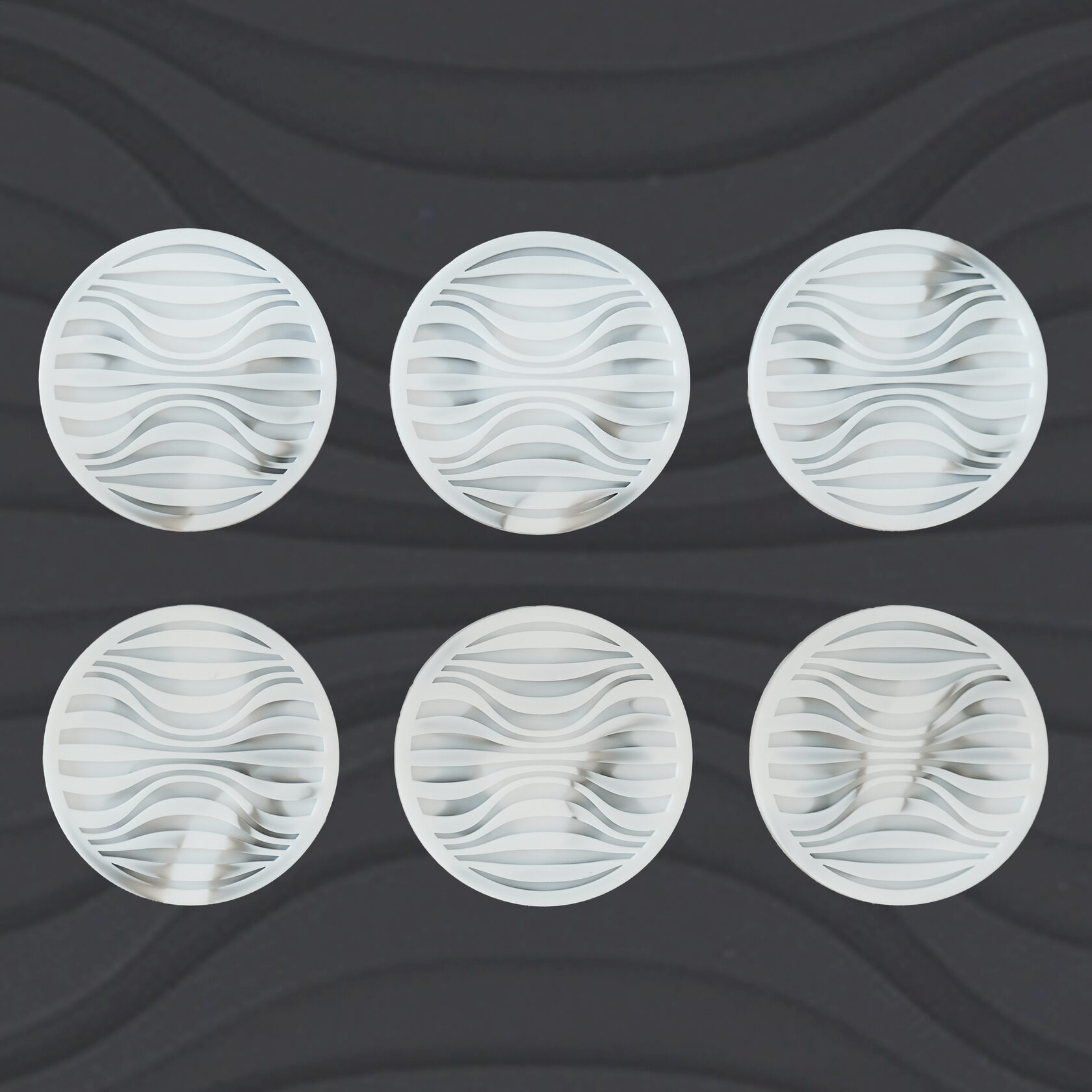 У каждой есть 2 стороны с разным рисунком: - сторона с волнами подойдет для холодных напитков или сушки мокрых стаканов/кружек - в борозды легко стечет вода и ни капли не прольется на стол - сторона с кругами будет хороша для горячих напитков и в использовании как крышка для заваривания в кружке трав
