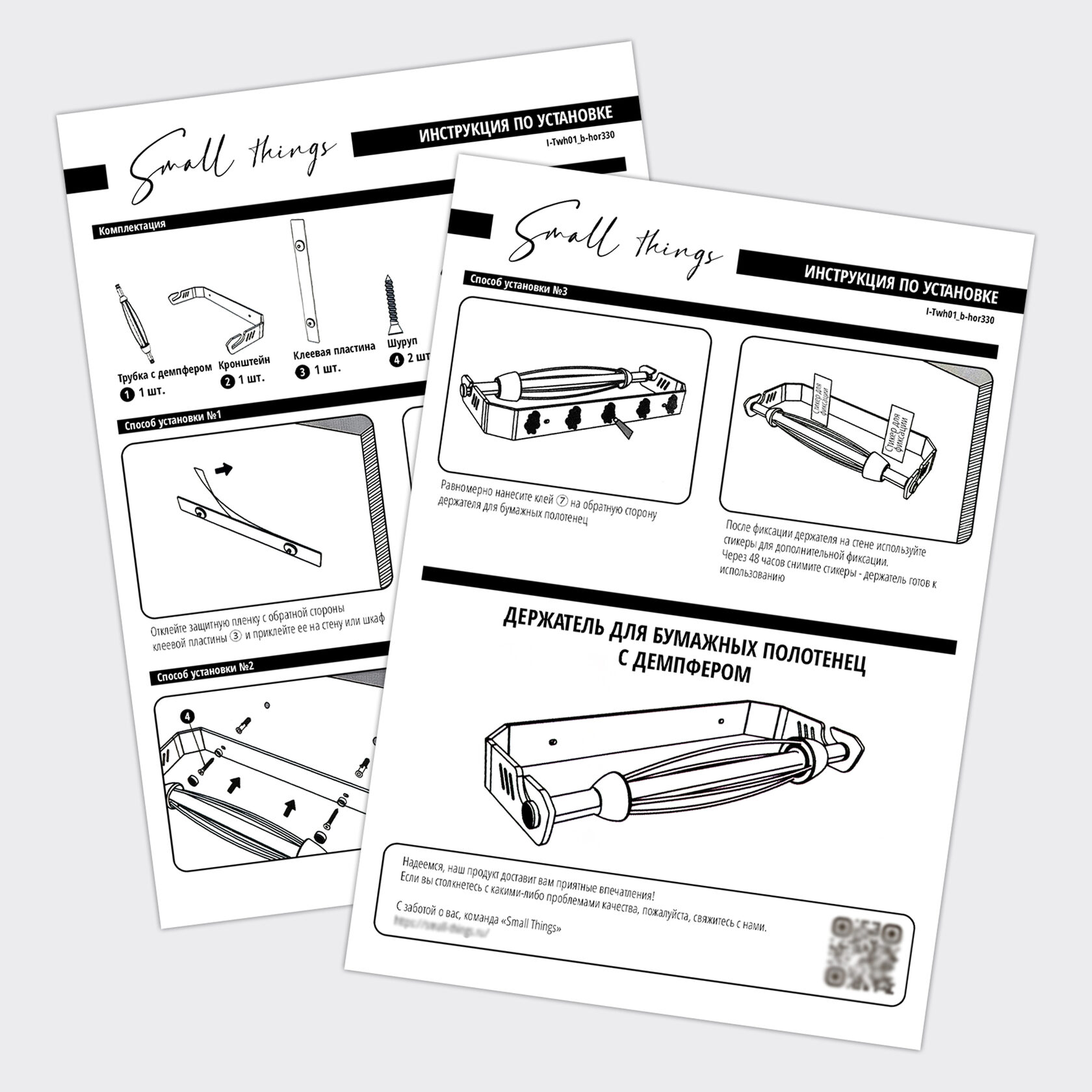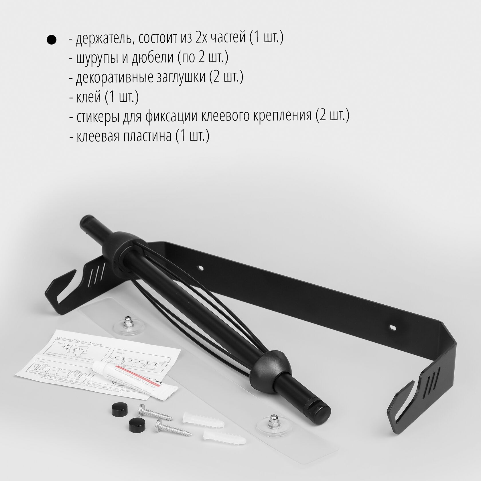 Комплектация - держатель, состоит из 2х частей (1 шт. - шурупы и дюбели (по 2 шт.) - декоративные заглушки (2 шт.) - клей (1 шт.) - стикеры для фиксации клеевого крепления (2 шт.) - клеевая пластина (1 шт.)